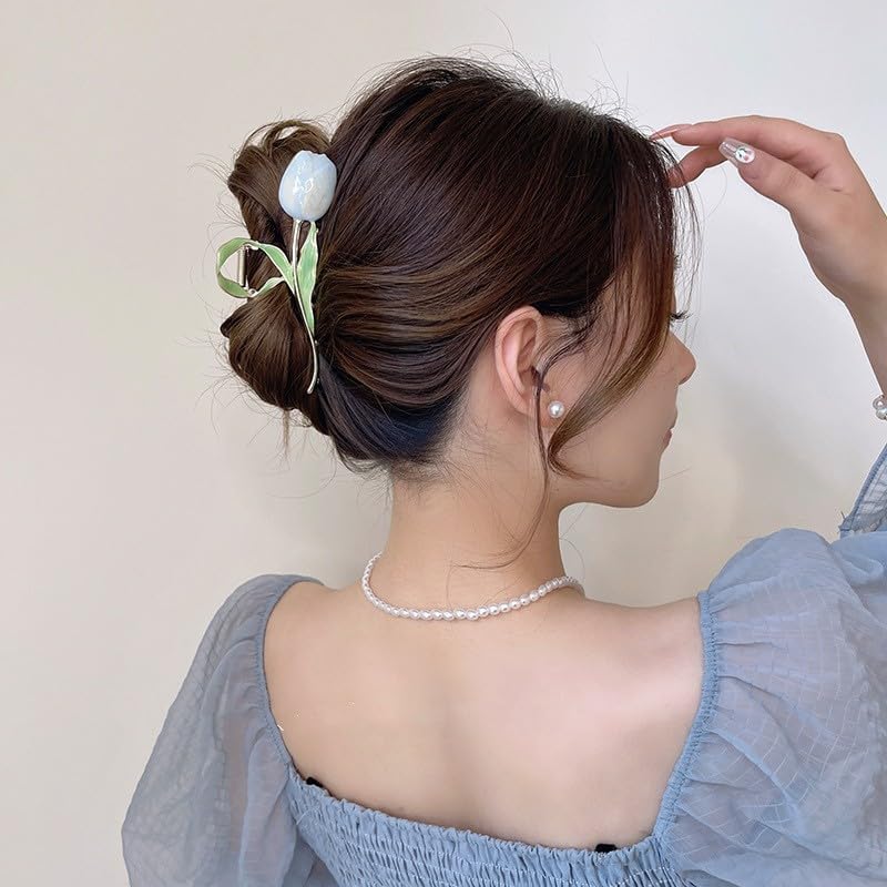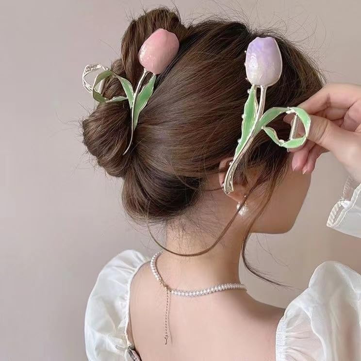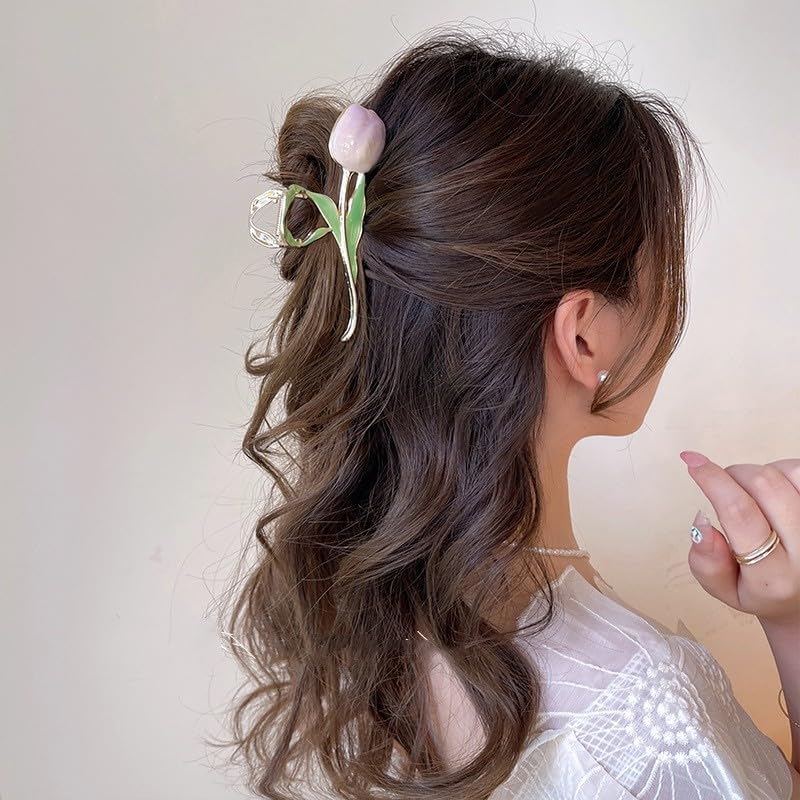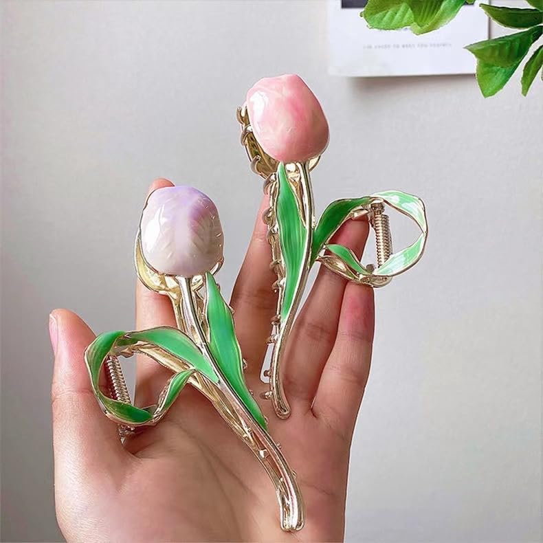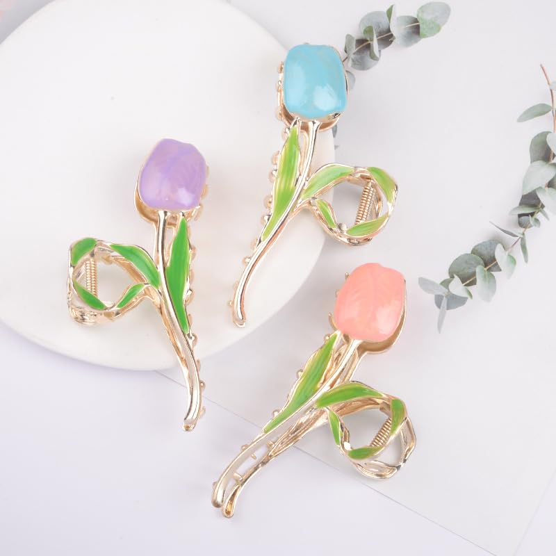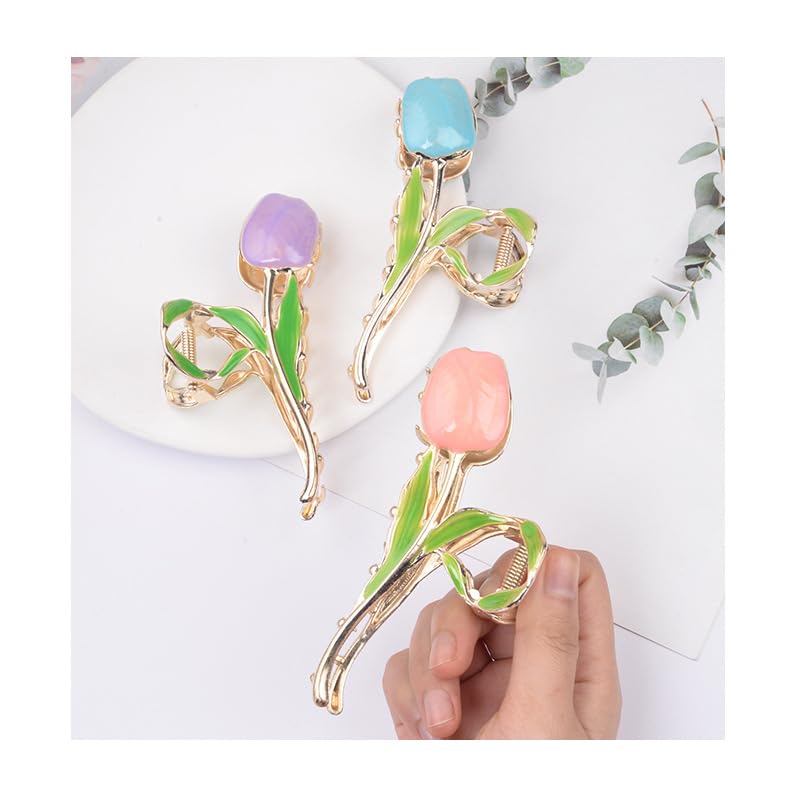 Elegant Tulip Design – Unique floral claw clips with realistic tulip petals in soft pastel shades and detailed gold stems. 💎 Premium Quality – Made with durable metal alloy and glossy enamel for a luxurious look and long-lasting wear. 💪 Strong Grip Claw Clips – Securely holds both thick and thin hair types without slipping or pulling. 🎁 Perfect Gift Choice – Ideal for birthdays, anniversaries, bridesmaids, or festive gifting. 👧 Versatile & Stylish – Complements everyday outfits, weddings, date nights, and special events.