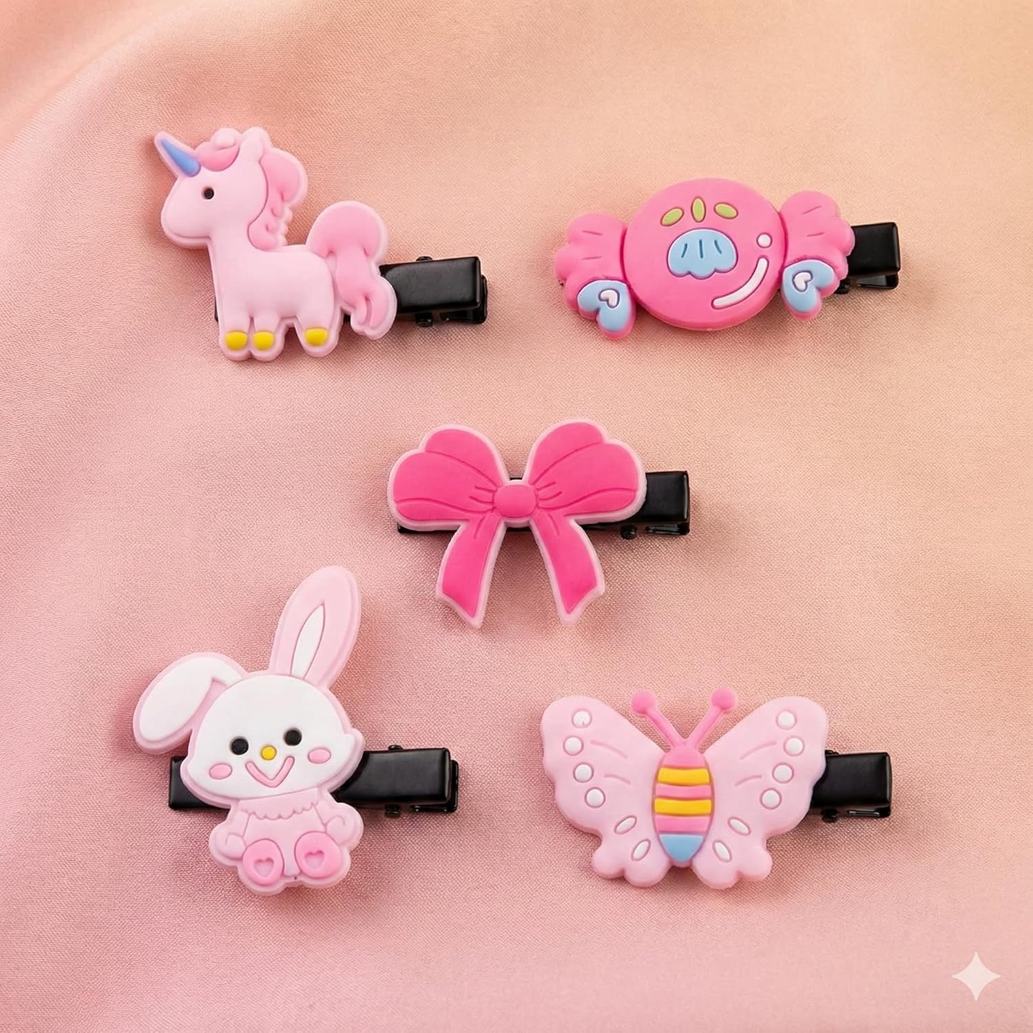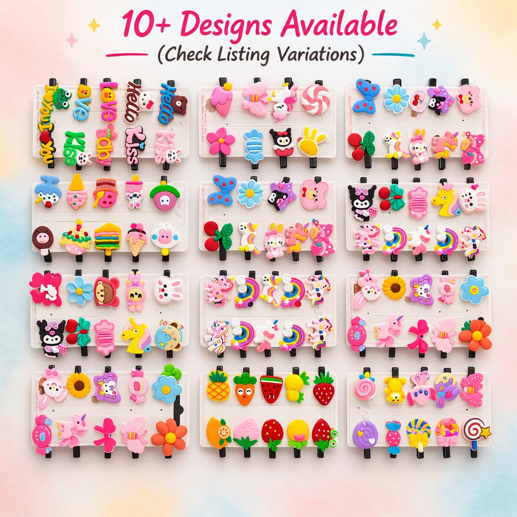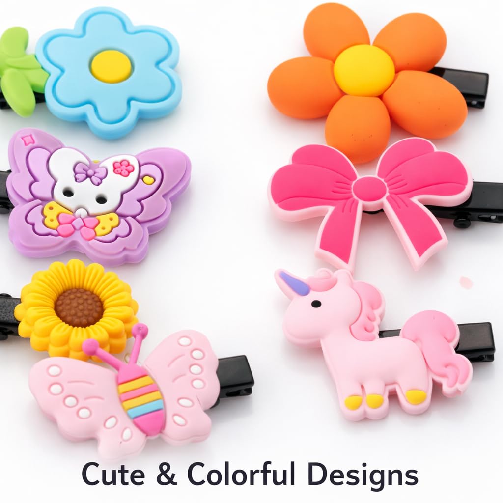 🌸 10-Piece Cute Hair Clip Combo Includes 10 adorable clips featuring flowers, butterflies, unicorns, bows, and candy-style designs in bright pastel colors.