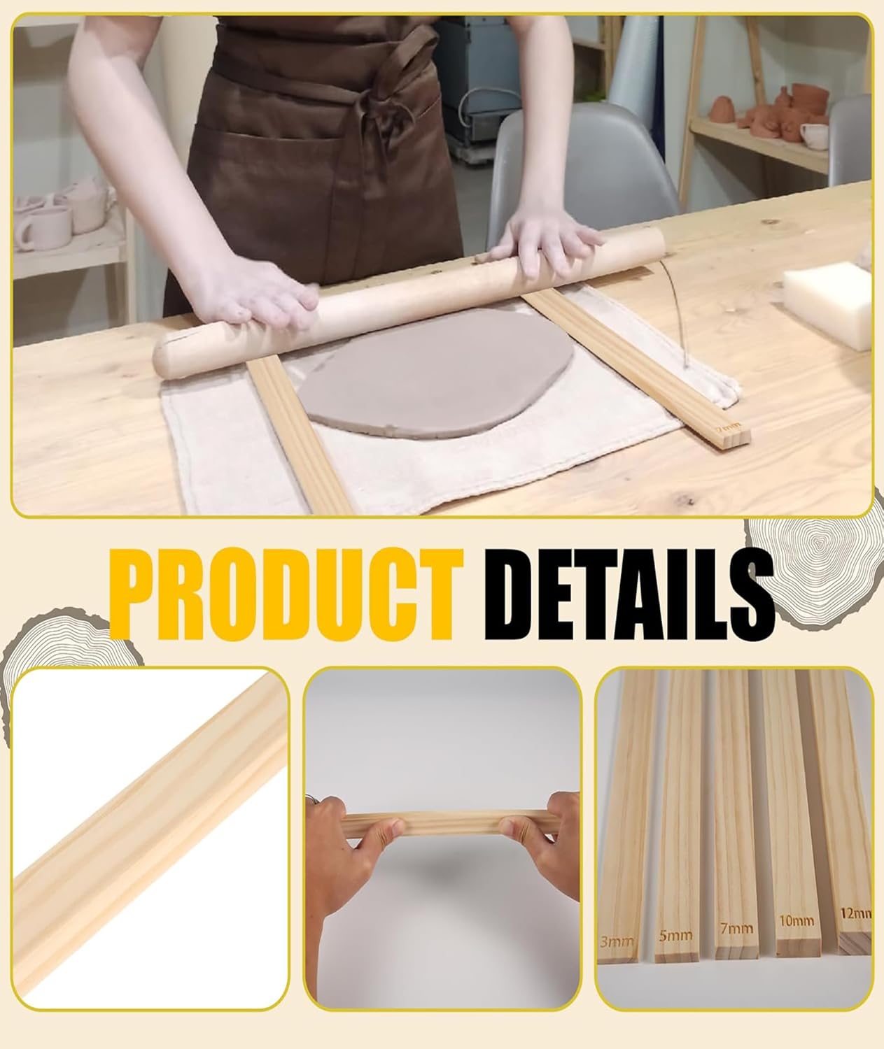 Precision Clay Roller Guides: Each of the five sizes comes with two guides, allowing for precise and uniform thickness in your clay creations; The smooth wooden surface ensures easy rolling without sticking; Ideal for detailed clay designs and professional pottery techniques.