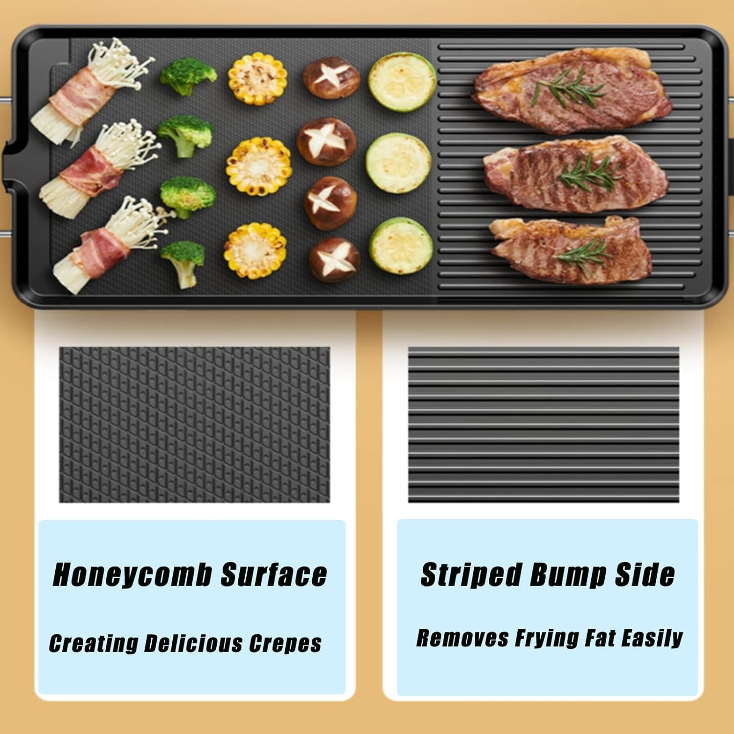 🍗【Stick-free Cooking Experience】Our electric griddle is made of premium nonstick surface which offers you a stick-free cooking experience for meat, vegetables, fish, fried dishes. It requires little grease on the non-stick surface, thereby producing healthier food. Cleaning can be done easier as well.