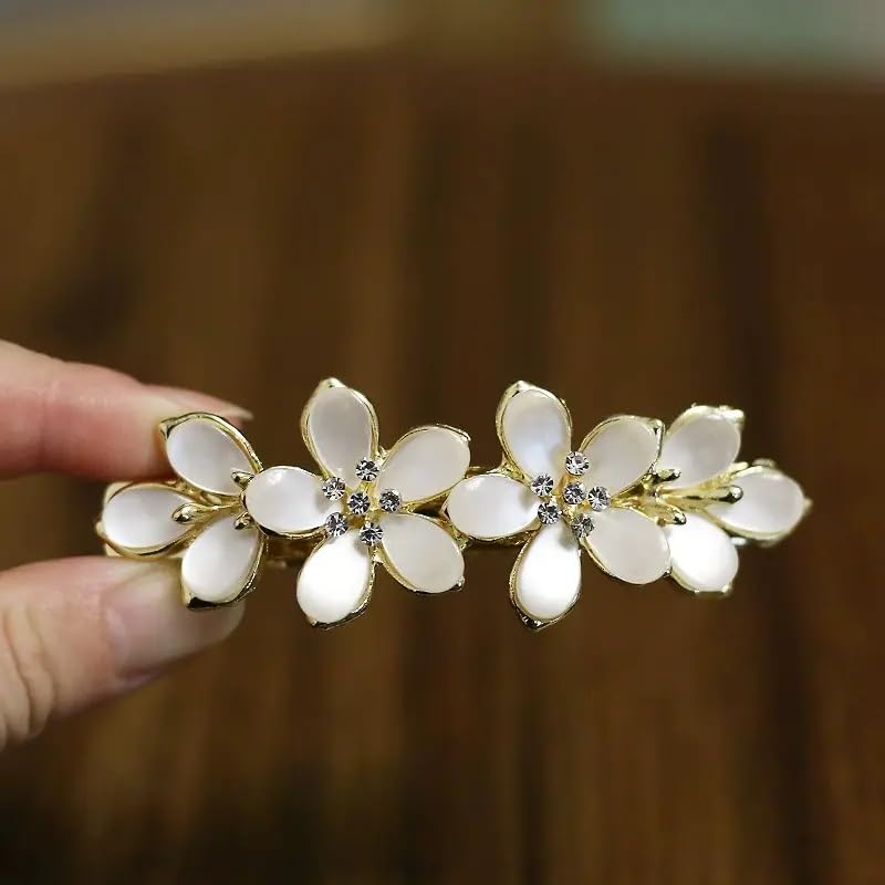 Design: Adorned with meticulously arranged opals, rhinestones, and pearls, these French hair barrettes for women boast a captivating aesthetic. The intricate design showcases artfully arranged elements, such as flowers or bows, enhancing their allure and ensuring they stand out as an eye-catching and sophisticated accessory for various occasions.