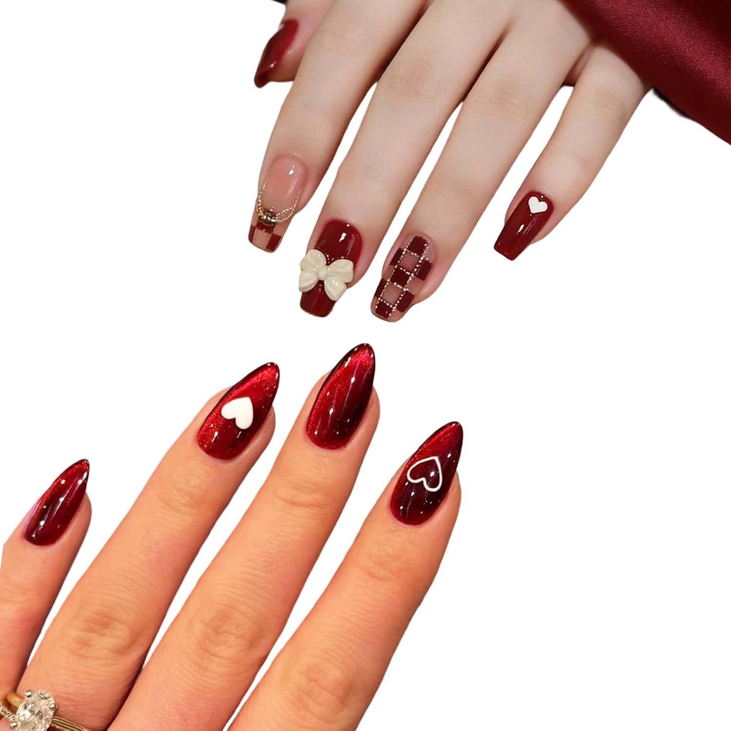 [Elegant Design] These press on nails feature a charming heart and checkerboard pattern in a deep red shade, perfect for adding a touch of sophistication to any look; The cat-eye effect enhances the overall aesthetic, making them ideal for special occasions like weddings and parties