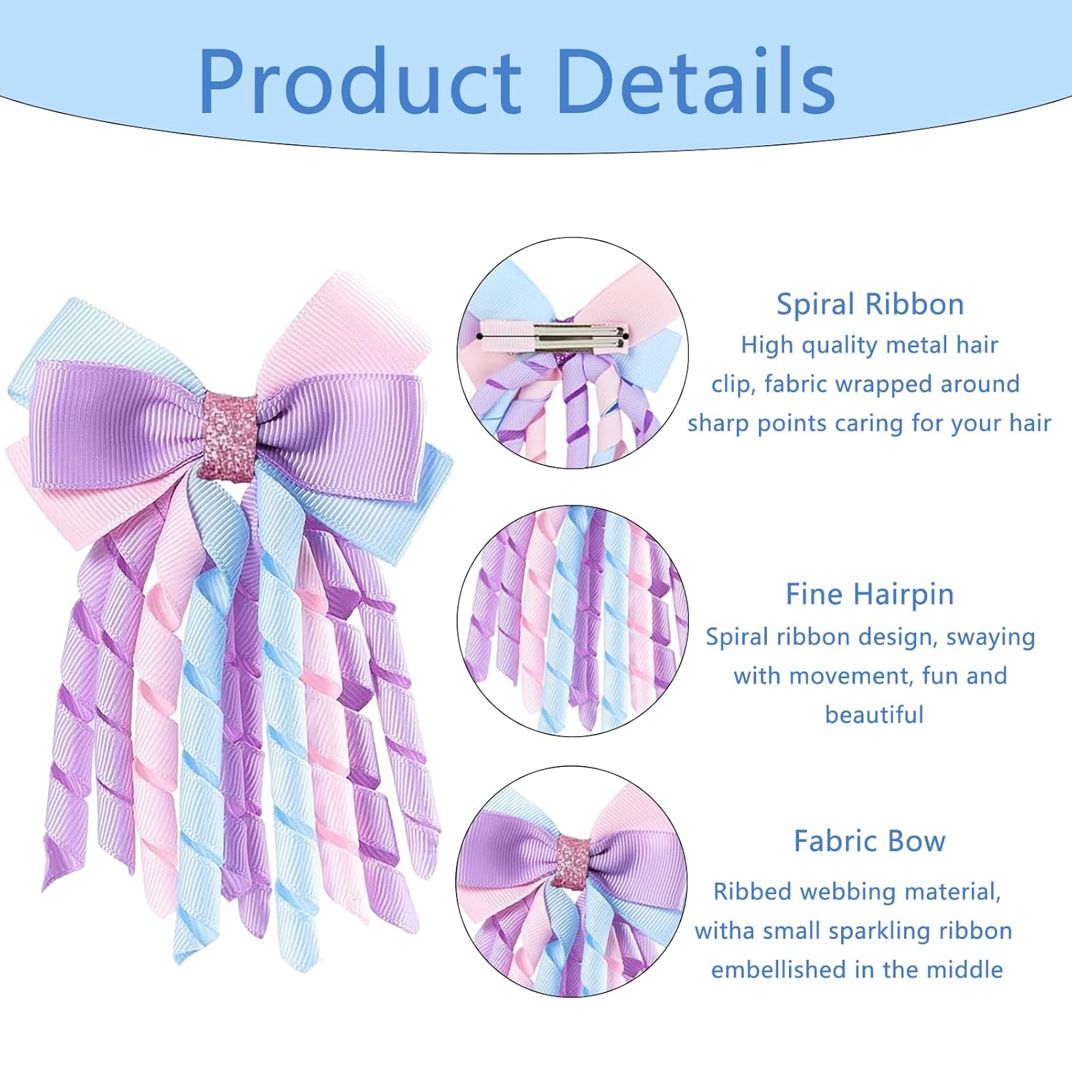 Cute Hair Clips for Girls: Featuring a playful bow design in vibrant purple, blue, and pink colors; The fabric ribbons ensure durability while maintaining a soft and comfortable feel, making them ideal for sensitive scalps