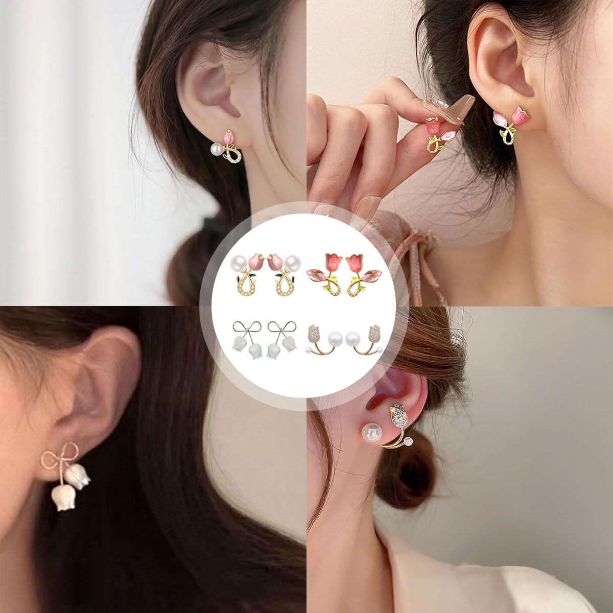 4 Pairs Studs for Women, Korean Earrings for Girls Stylish, Dainty Pink and White Floral Jewelry, Elegant Gift for Daily, Party, Wedding