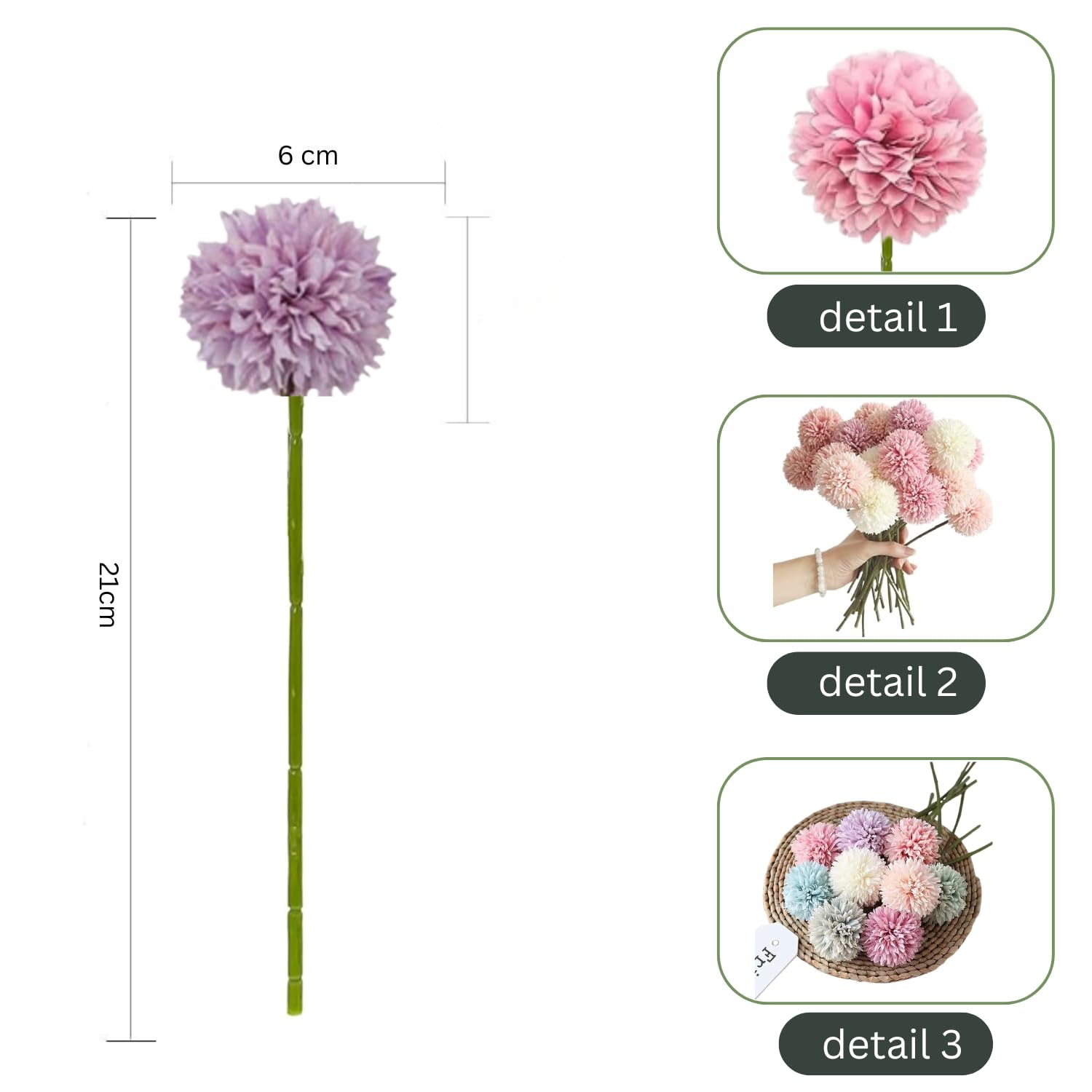 VERVENIX 5-Piece Artificial Chrysanthemum Ball Hydrangea Flower Sticks
