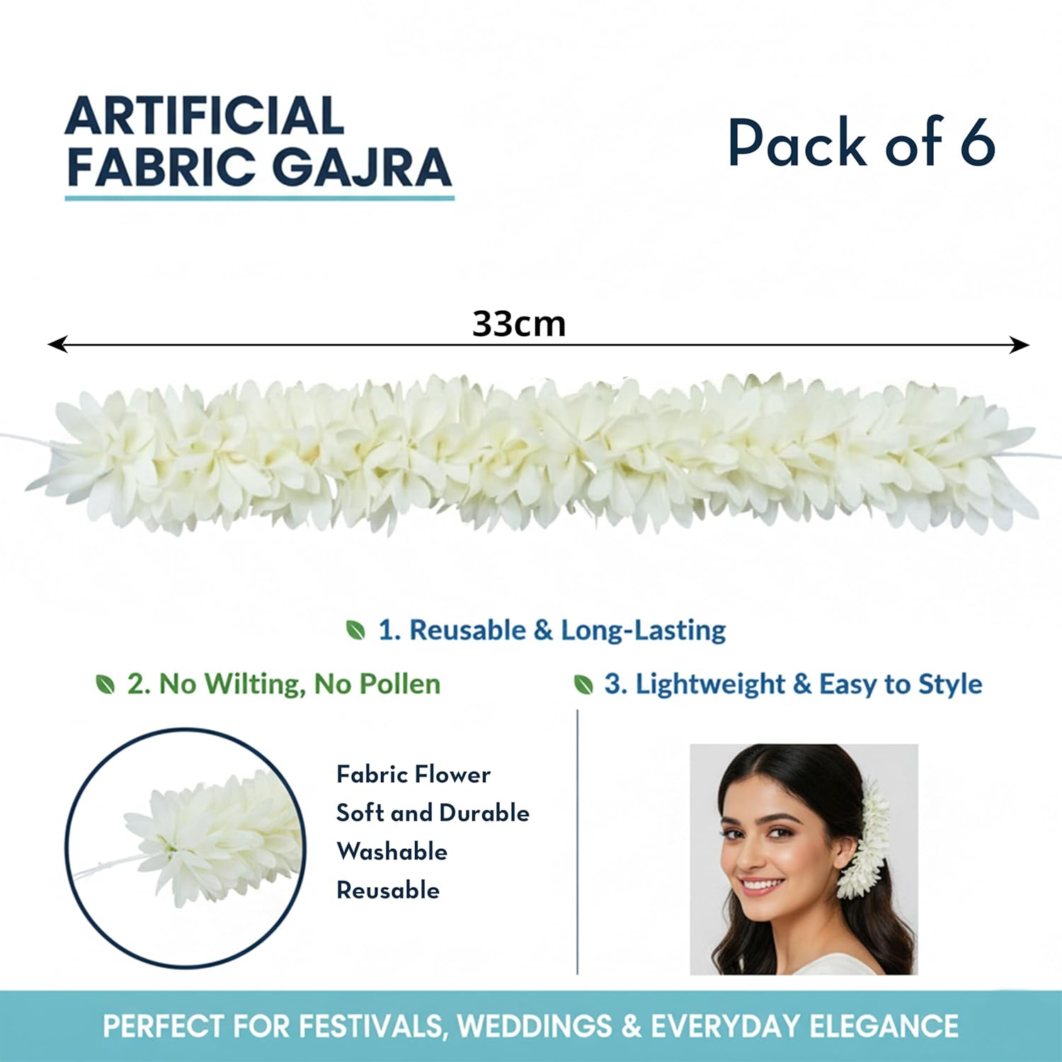 6 Pack White Mogra Artificial Washable Gajra for Hair Indian Bun Braid, Non Scented Fabric Jasmine Flowers, Veni, Bridal Hair Accessories for Women, Wedding, Reusable Cloth Floral Girl Accessory (Pack of 6)