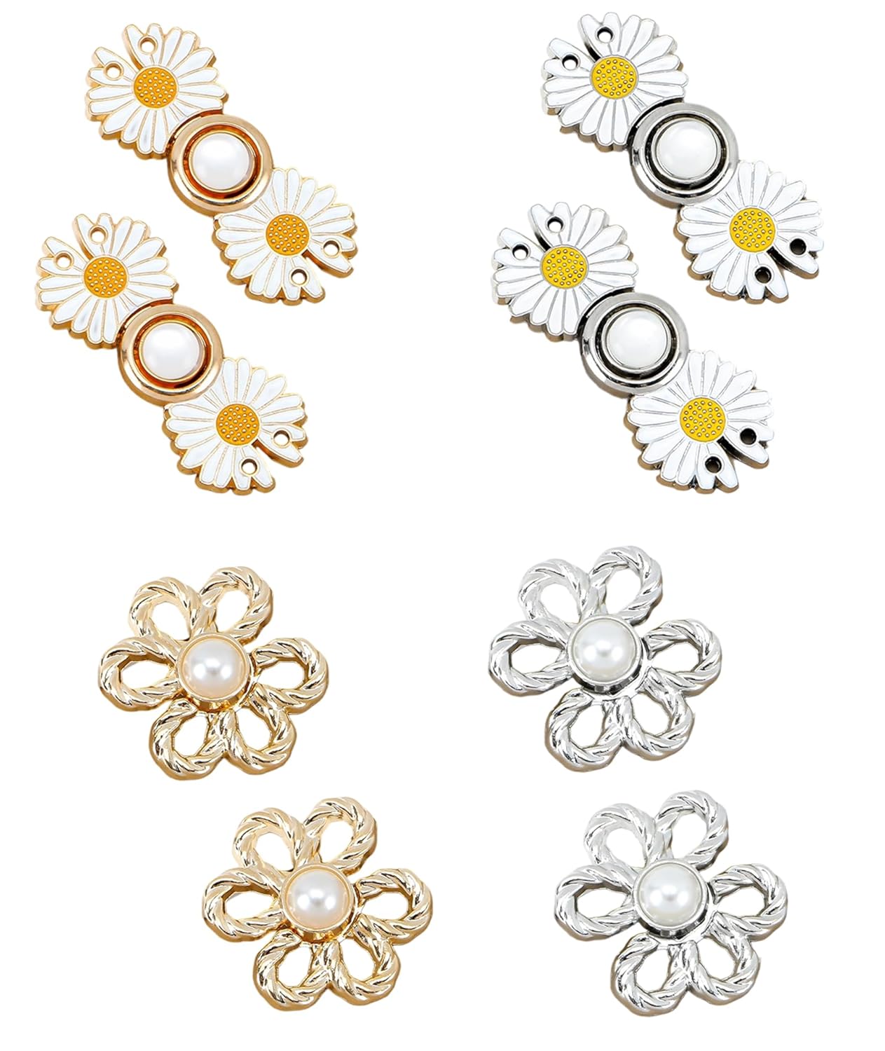This set of 8 jeans tightening clips offers a practical and stylish solution for adjusting waist sizes on various garments. The package includes two golden six-petal flowers, two silvery six-petal flowers, two golden-white daisies, and two silvery-white daisies – providing versatile options to match different outfits. Made from durable alloy material, these waist tightener clips maintain their shape through repeated use while adding a fashionable accent to your clothing.