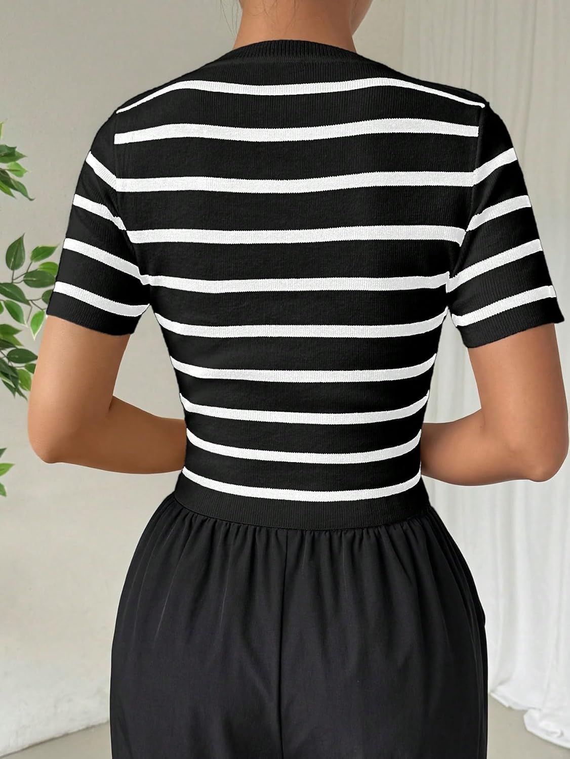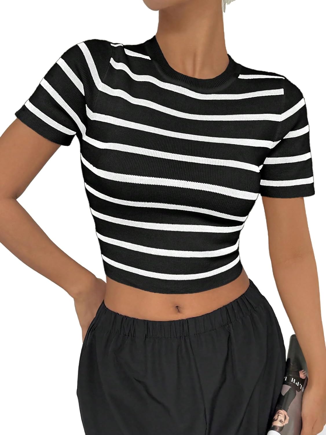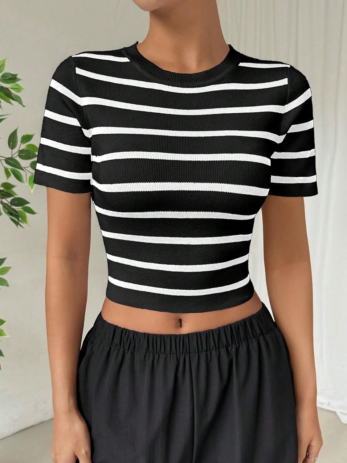 Aahwan Women’s & Girl’s 100% Polyester Black Striped Short Sleeve Slim Fit Crop Top