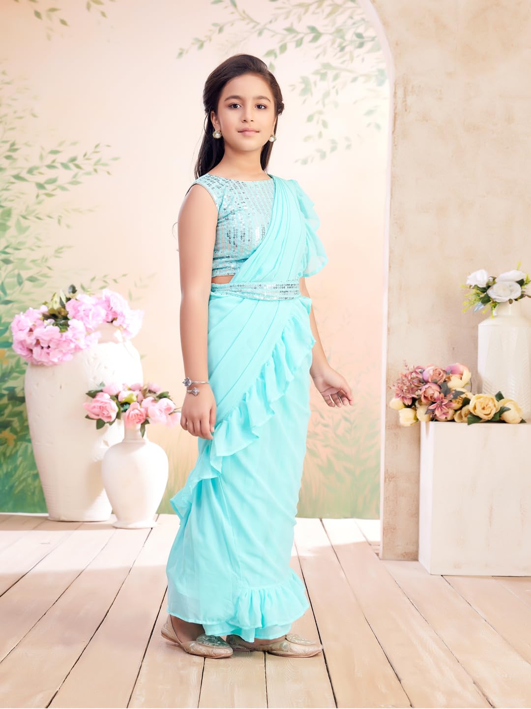 Aarika Girls Ethnic Wear Sea Green Colour Sequin Embroidery Georgette Lehenga Saree With Attachable Dupatta