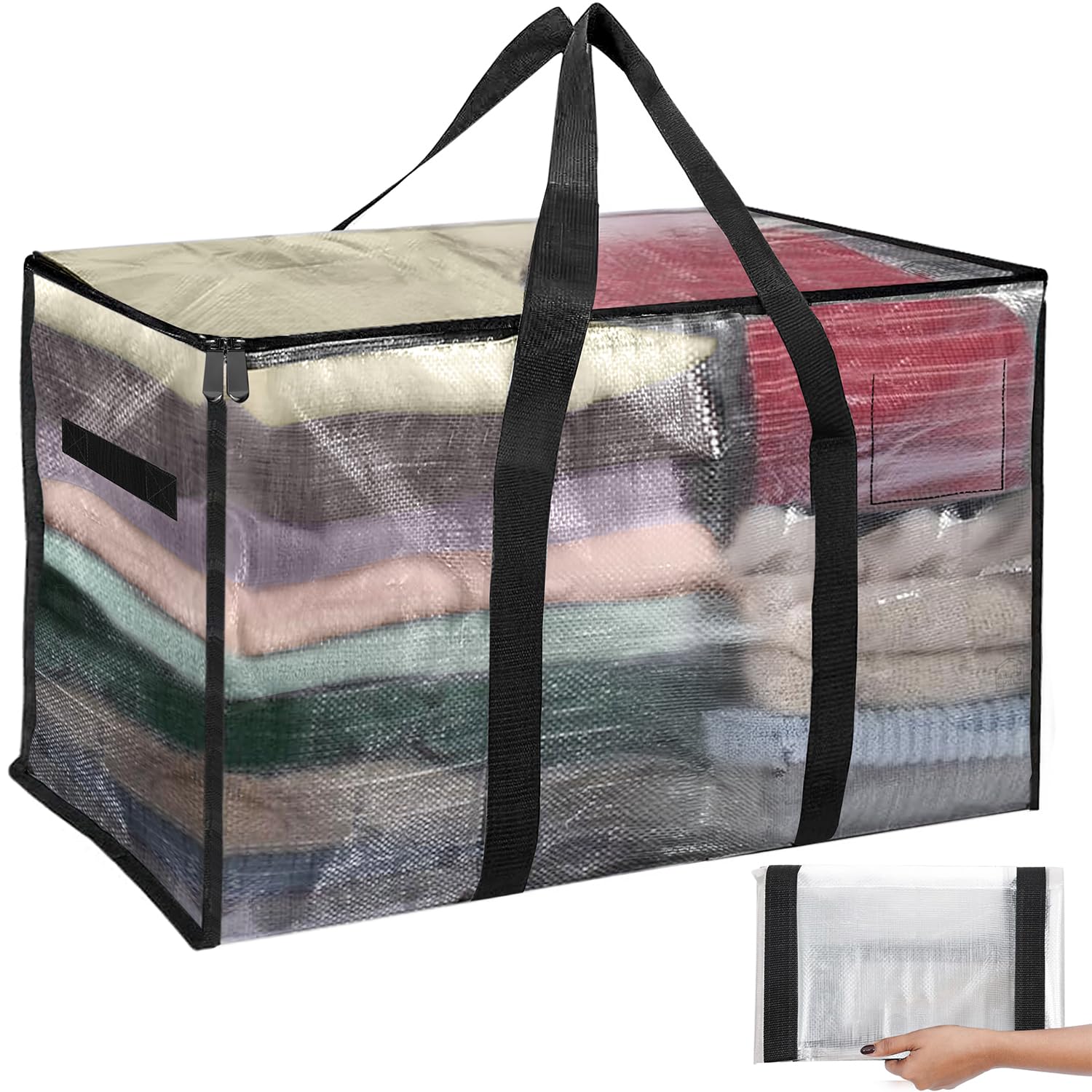 UNIQUE DESIGN: The top side of the blanket storage bags can be fully opened and is much easier to organize. A convenient clear tag pocket is located on the front right side for customized labels & easier recognition. The innovative wrap-around cross-stitched reinforced handle can support heavier loads. The dual hidden rust-proof zippers protect things from moisture, dust and insects. It has 2 side handles for easy access.