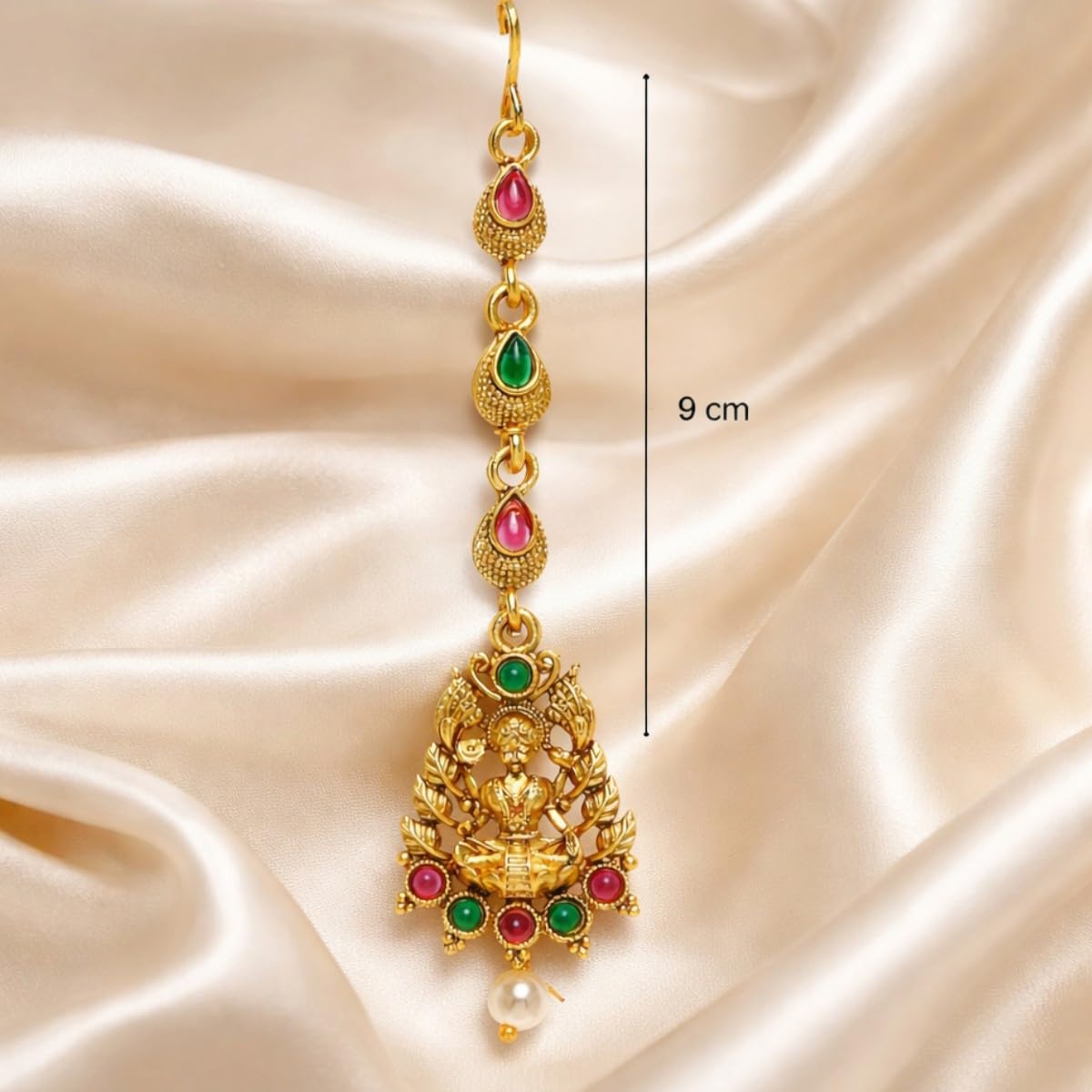 Accessher Matte Gold Plated Temple Jewellery Inspired Laksmi Mata Maang Tikka/Maang Tika Embellished with Ruby and Emerald for Women and Girls Pack of 1