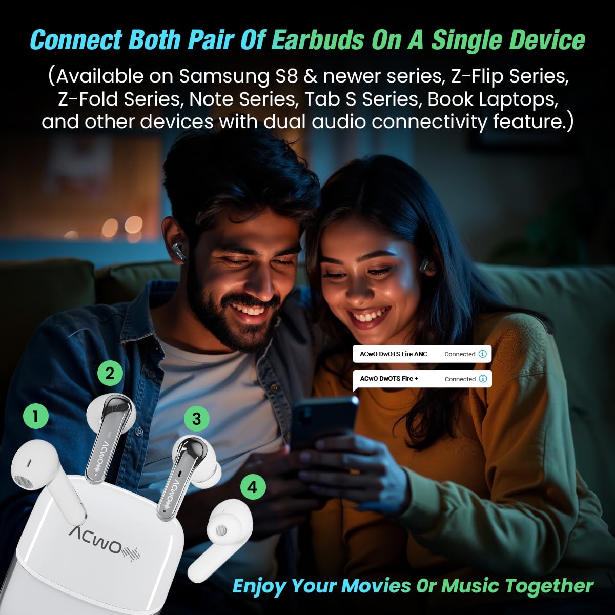 ✅[Two Way To Enjoy Your Fire ANC]: Imagine the flexibility of sharing your favorite sounds in two different ways. With the ACwO DwOT Fire ANC, you can connect each pair of earbuds to separate devices – perfect for when you and a friend want to enjoy different content without compromise. Alternatively, you can connect both pairs to a single device, making it ideal for those cozy movie nights or binge-watching sessions with someone special, ensuring every scene is enjoyed together.