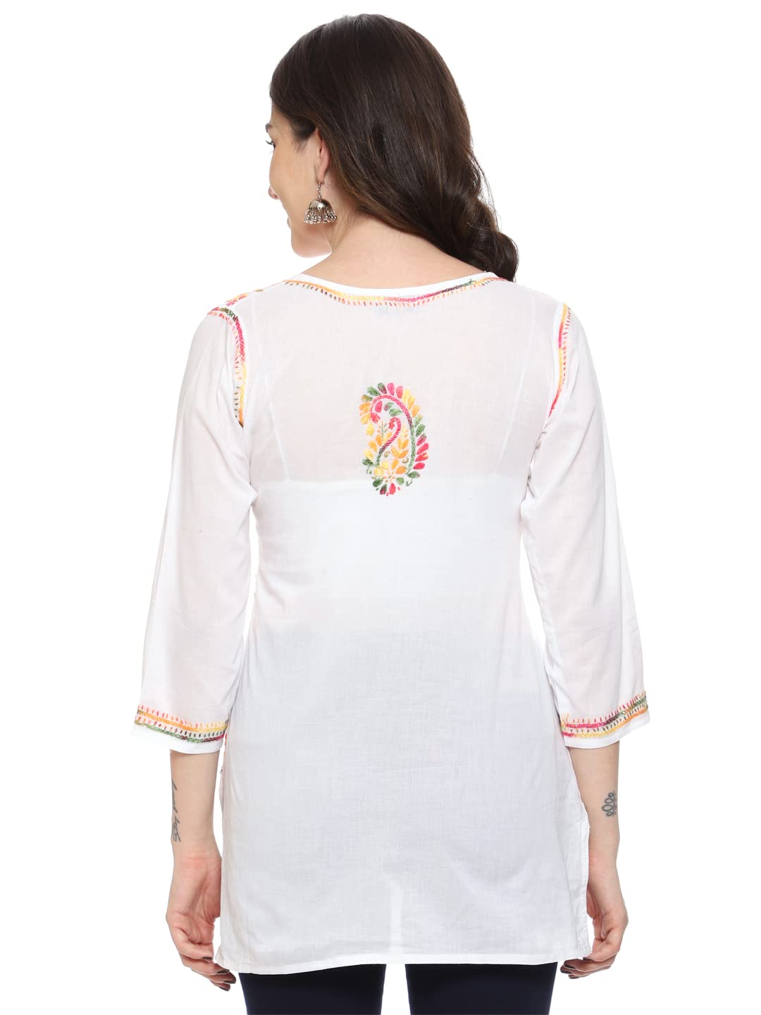 Breezy and elegant, this White Cotton Chikan Top is a celebration of timeless hand embroidery and modern style. Adorned with intricate Ulti Bakhiya, Keel Kangan, and Ghas Patti stitches, each thread is delicately woven using multi-colored cotton, creating a vibrant yet graceful look. Its lightweight fabric ensures day-long comfort, while the pastel palette makes it a perfect pick for summer outings or casual workdays. Handcrafted by skilled artisans and GI-tagged for authenticity, every piece carries subtle variations that highlight the uniqueness of true craftsmanship. Pre-washed for zero color bleed or shrinkage, this top lets you flaunt heritage with a fresh, contemporary twist.