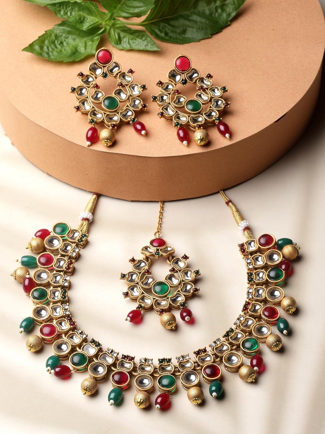 Adiva Latest Stylish Traditional Gold-Plated Kundan Stone Studded & Pearl Handcrafted Necklace Earrings with Maang Tikka Jewellery Set for Women & Girls