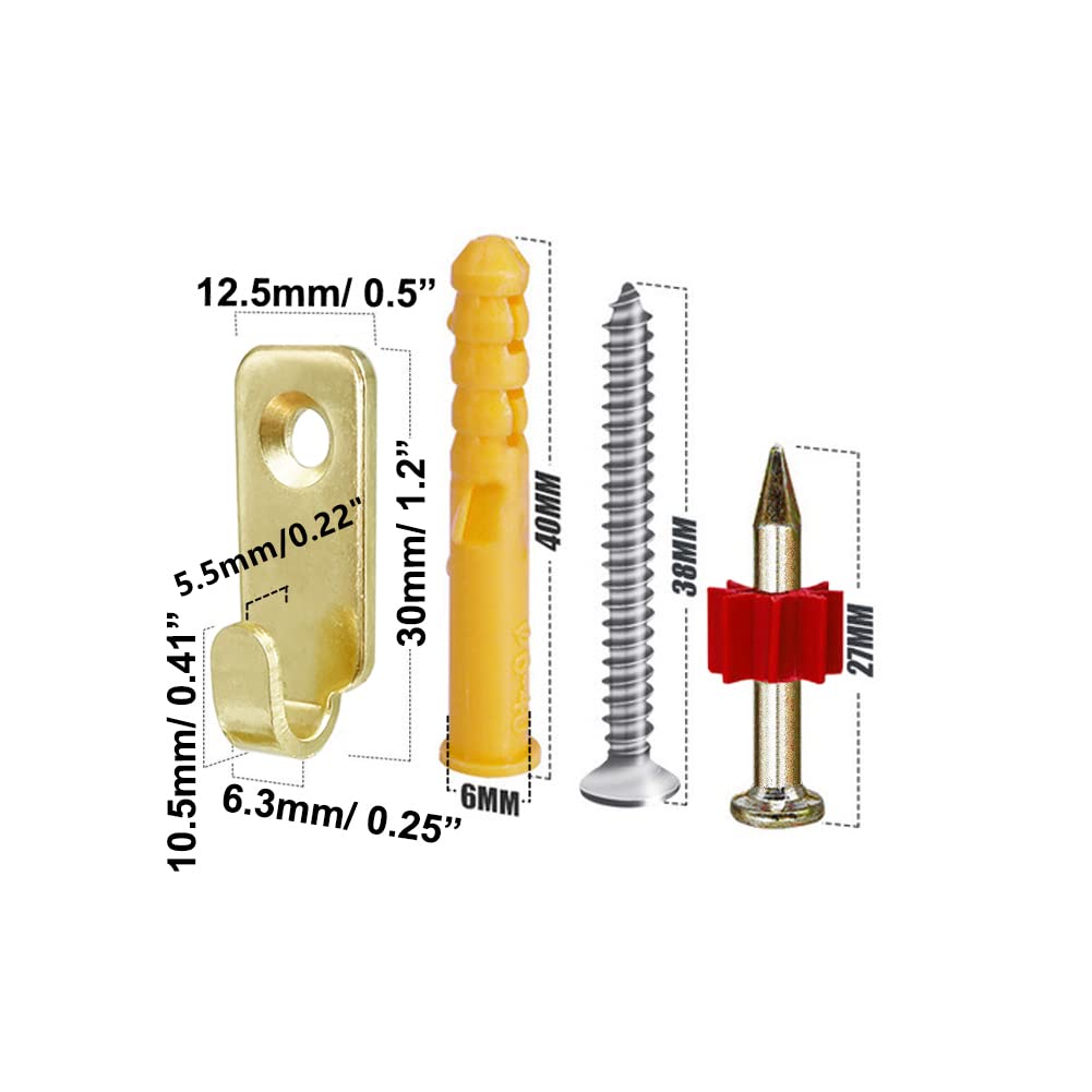 Gold color brings it an elegant look. Cute size: 29.5mm x 12.5mm/ 1.16 Inch x 0.5 Inch, J Head Width: 6mm / 0.23 Inch. But Heavy Duty: Tested that single hook holds 10.5 kg / 23 lbs dumbbell is OK. Wall mounted mini J shaped hook for mirror picture frames hanging wire/D rings/keyhole hangers, and also you can use these hooks as shower caddy hooks/shower basket hooks. Hardened 304 stainless steel material, heavy duty and rust resistence. 10pcs Wall mounted mini J-Hook, mounting nails, inserts, self tapping screws are included. Mini Wall Hanger for universal use, if you use it for hanging keyhole, please check sizes before ordering.