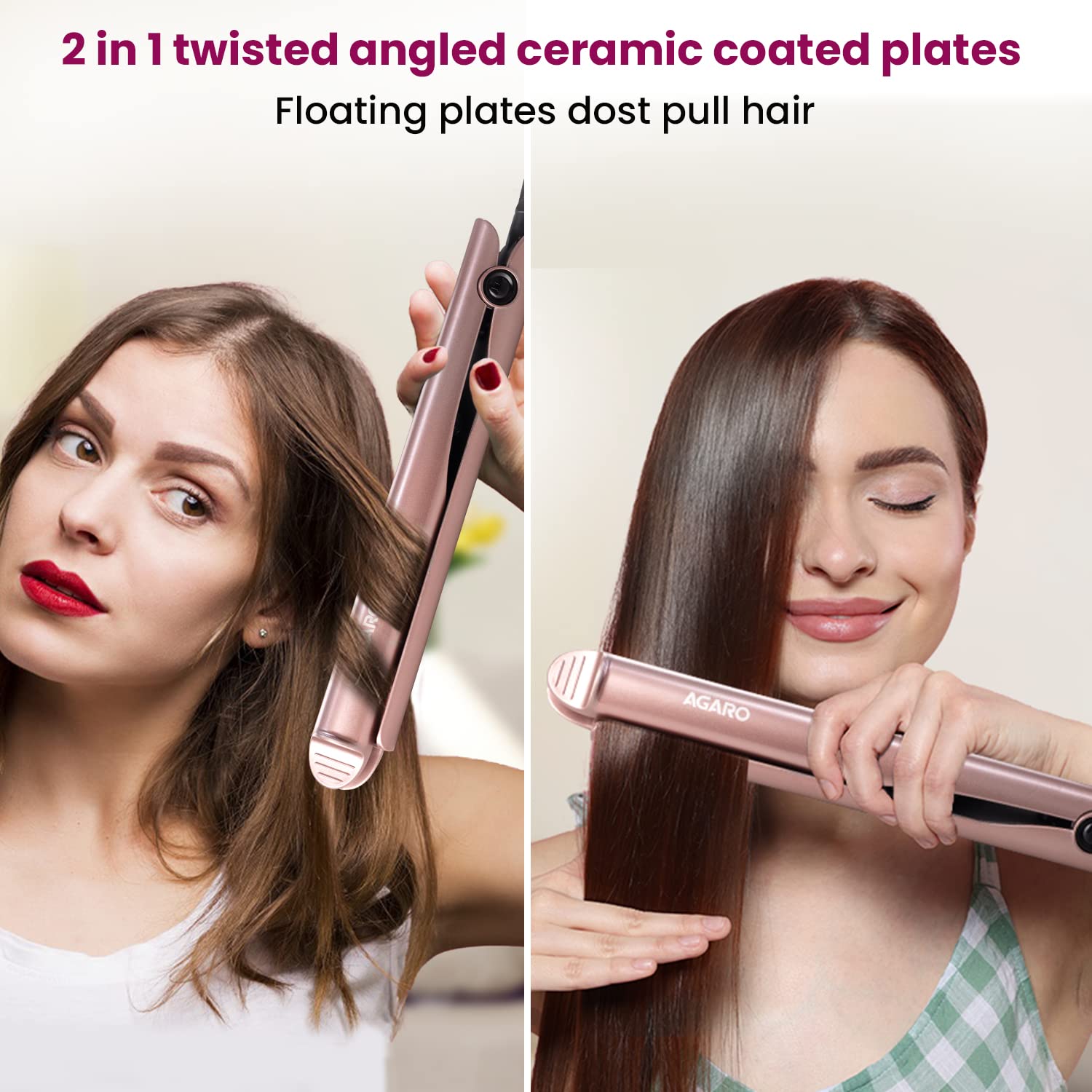 AGARO HS1927 Hair Straightner, Ceramic Coated Floating Plates, 3 Tempertaure Settings, Fast Heating Hair Iron, 2-in-1 Twist Angled Plates, PTC Heating, Twist Straightening, Curling, Hair Styling For Women, Rose Gold