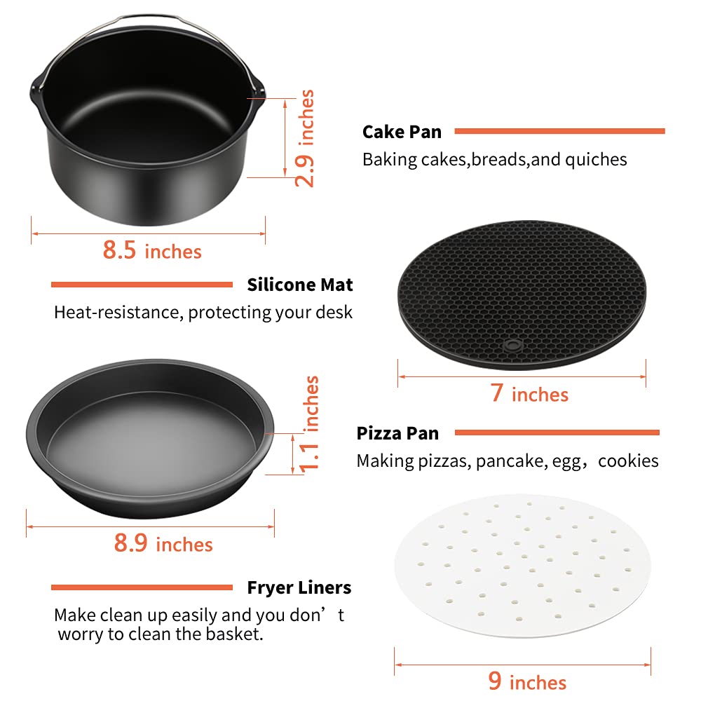 AIR FRYER ACCESSORIES SET OF 12: Includes 1 x9” Cake Barrel, 1 Pizza Pan, 1 Cupcake Pan, 1 Metal Holder, 1 Skewer Rack, 1 Silicone Mat, 2 Silicone Mini Mitts, 1 Food Tong, 1 Oil Brush,1 Cookbook, 6 silicone baking cup, 100 Fryer Liners. Meet all your needs.