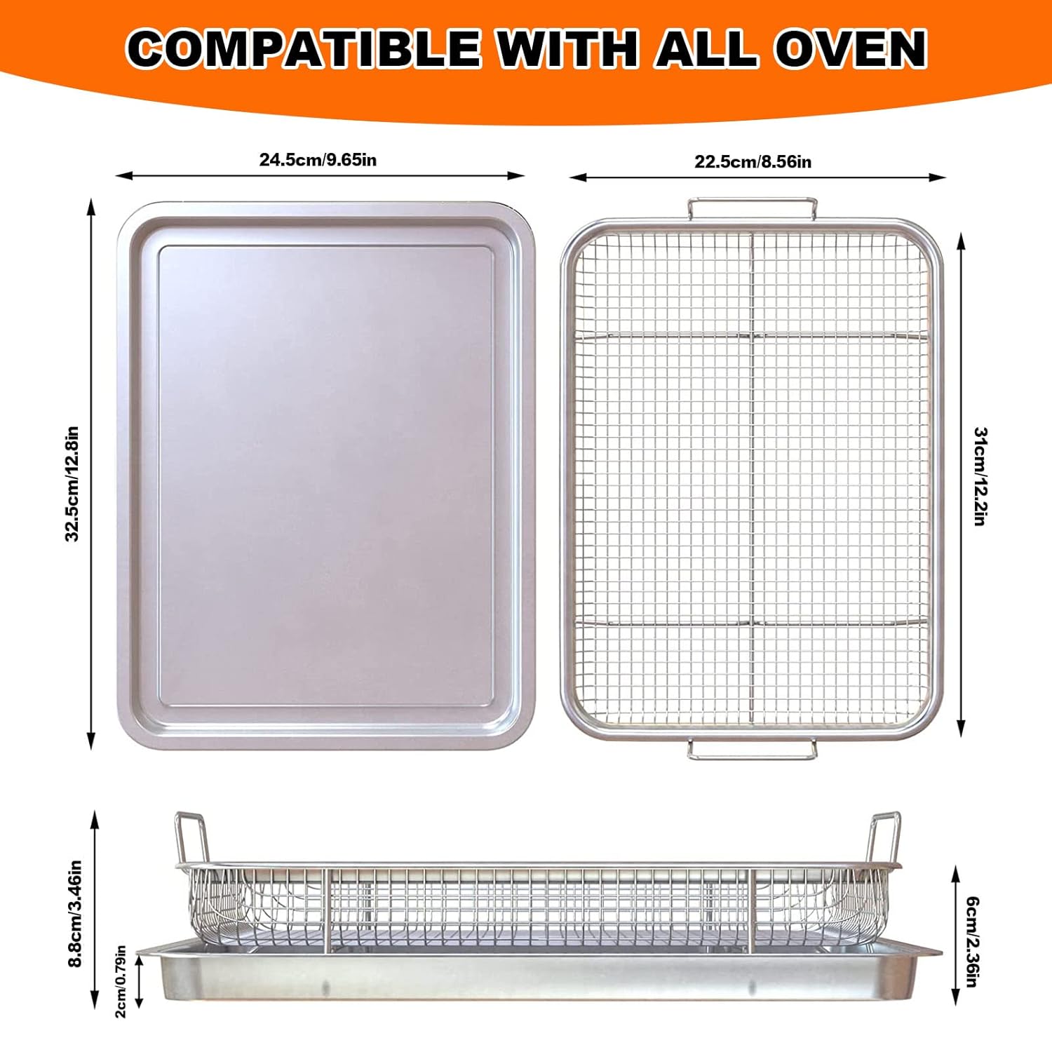 High-Quality Materials – The baking pans set is made of the highest quality, highly durable food-grade non-toxic material, heat-resistant 304 stainless steel, and is dishwasher safe. Basket Dimensions: 12.8 x 9.65 x 3.46 inches. (Please see the picture for details)