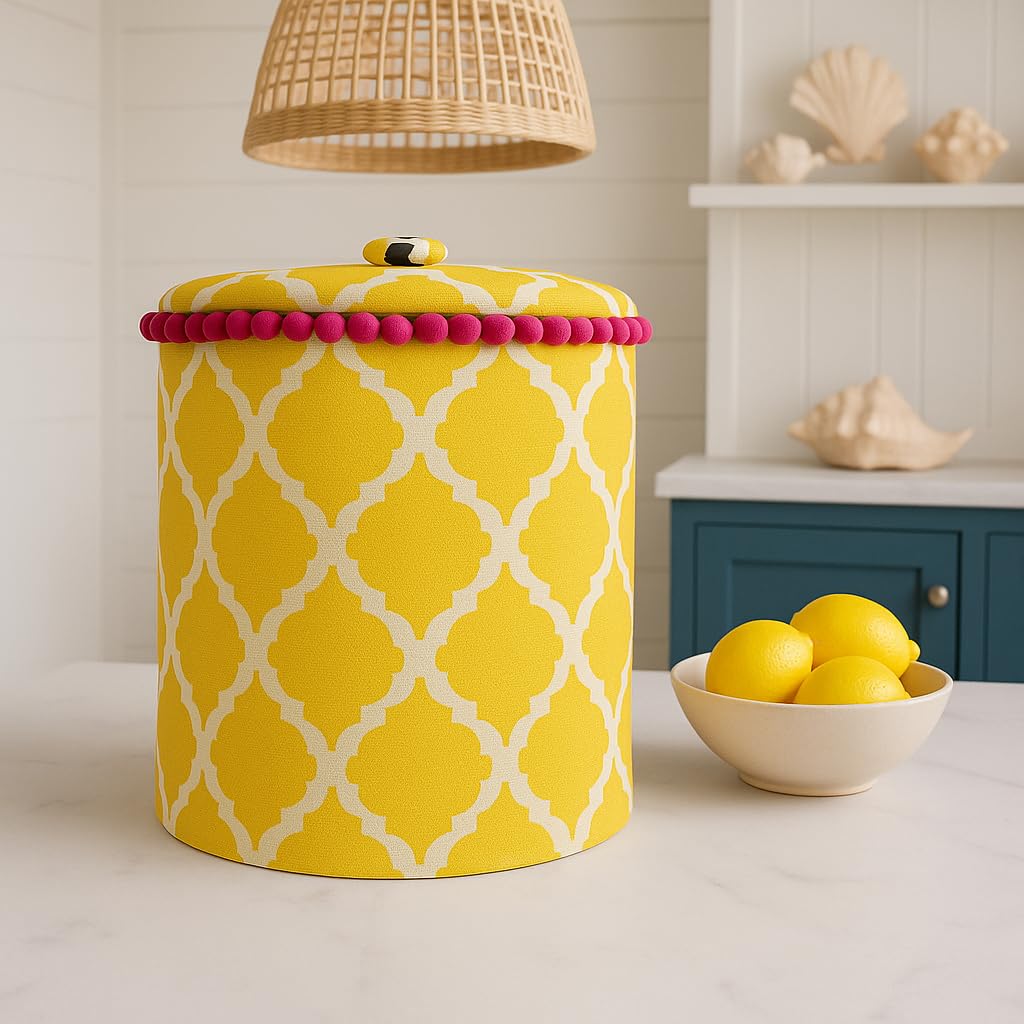 ✅ Protects Against Dust, Grease & Stains This mixer grinder cover offers all-around protection against dust, grease, stains, and daily fingerprints. A must-have for Indian homes and busy kitchens, it keeps your appliance spotless and reduces the need for frequent cleaning. Ideal for those searching mixer grinder dust cover, kitchen appliance cover, or protective decorative mixer cover for daily use. Add a bold statement to your kitchen while protecting your appliances with our Mixer Grinder Cover with Handle & Pink Pom Pom – Yellow diamond Print. Specially designed to fit most standard-size mixer grinders, this round mixer grinder cover features a 10″ height and 9″ diameter, ensuring a snug fit for brands like Philips, Sujata, Preethi, , Bajaj, and more. Crafted from high GSM, thick and breathable fabric, this dustproof mixer grinder cover offers excellent protection from dust, stains, oil, and moisture.It ensures your appliance stays clean and scratch-free even in heavy-use kitchens. The Yellow diamond printed mixer grinder cover adds a touch of ethnic elegance with a modern twist, while the bright pink pom pom lace around the top brings a splash of color. A fabric top handle makes this mixer grinder cover with handle extremely convenient to lift and use daily. This is more than just a stylish piece—it’s a functional kitchen appliance cover that’s also machine washable, making maintenance effortless. Simply toss it in the washing machine for easy, hygienic cleaning. Durable, breathable, and made for daily Indian kitchen use, it’s the perfect blend of form and function. Whether you’re looking for a mixer grinder cover for Preethi, a mixer cover for Philips, or a mixer grinder cover for Sujata, this versatile piece fits beautifully. Ideal for gifting or personal use, it’s a must-have for anyone browsing mixer grinder dust cover, decorative appliance covers, or designer kitchen cover