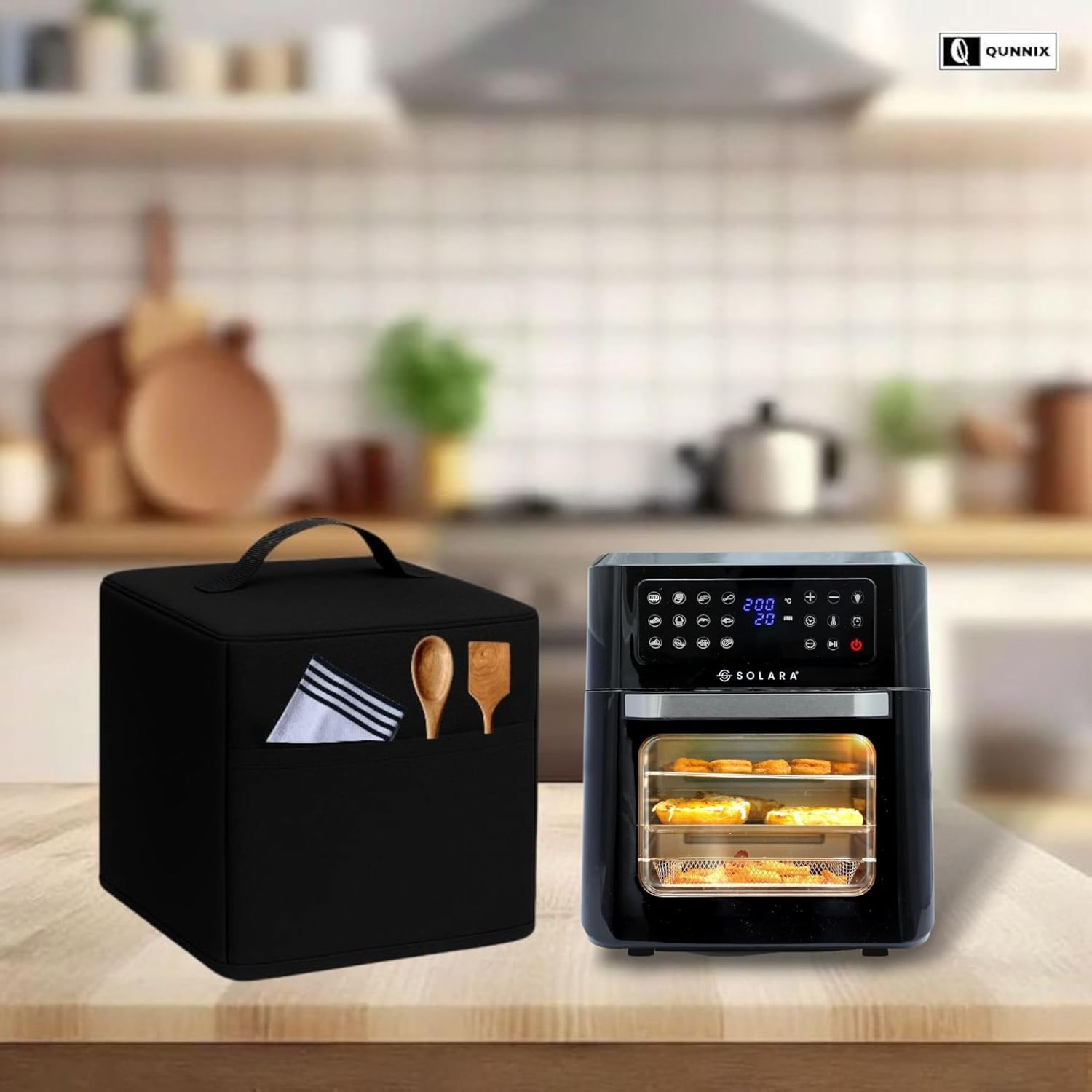 Keep your SOLARA 12L Air Fryer Oven clean, stylish, and ready for use with the QUNNIX Waterproof & Dustproof Cover. Crafted from premium, high-grade nylon, this cover offers superior protection against grease, spills, stains, scratches, and everyday dust, ensuring your appliance stays looking new. The sleek black design complements any kitchen décor while adding a touch of elegance. Its built-in front pocket provides convenient storage for accessories, recipes, or power cords, keeping your kitchen organized and clutter-free. The durable handle allows easy lifting and removal, making it practical for everyday use. Designed for long-lasting performance, this cover is lightweight, flexible, and washable, so maintenance is quick and effortless. Perfect for busy households or anyone who wants to prolong the life of their air fryer oven, the QUNNIX cover also protects from accidental spills and splashes while your appliance is not in use. Whether your air fryer is on the countertop, in a cabinet, or stored away, this cover ensures complete protection, helping maintain hygiene and prolonging appliance life. Ideal for families, small kitchens, or anyone who wants to keep their SOLARA 12L Air Fryer Oven spotless and ready to cook.