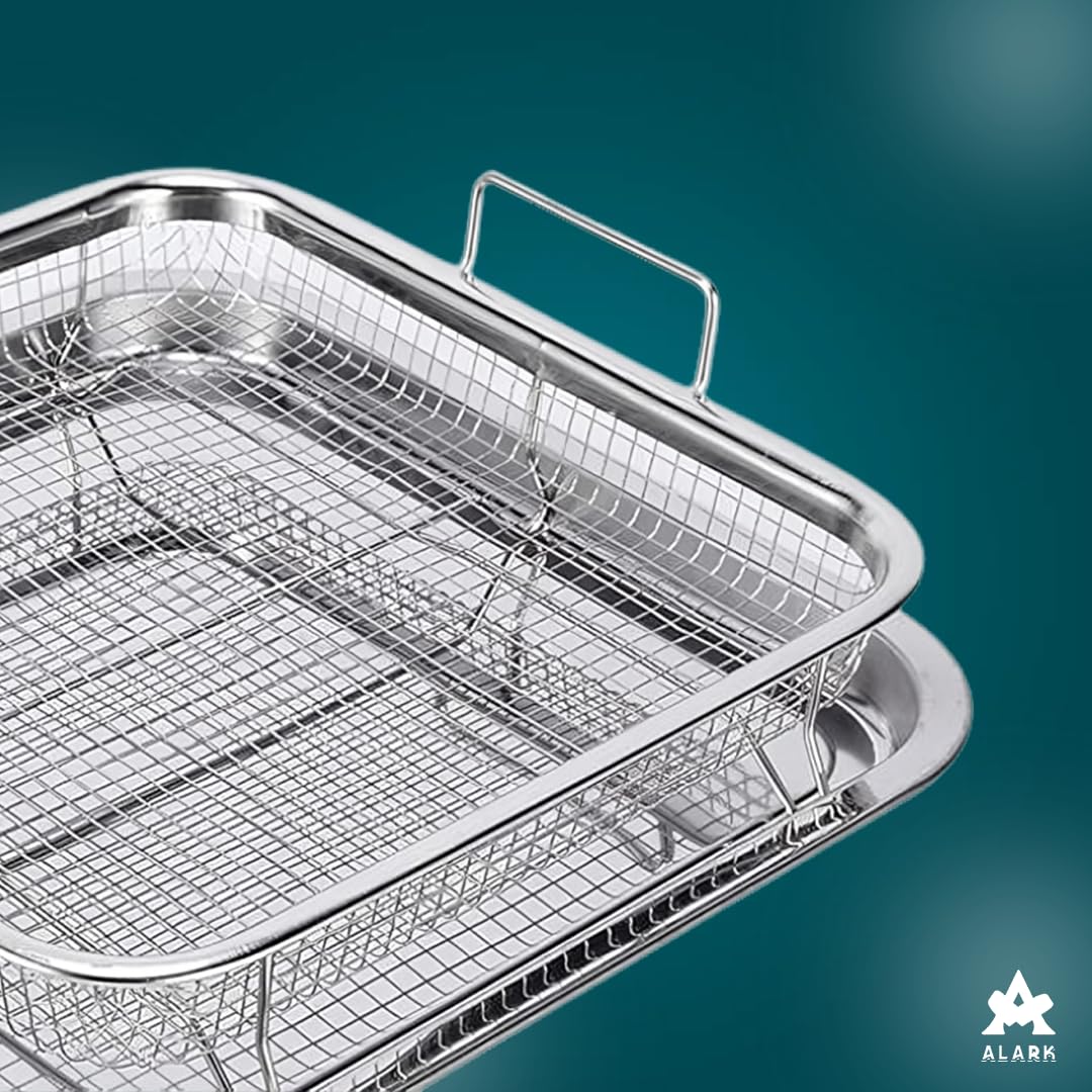 Alark Air Fryer Basket for Oven 2 Pieces Set Square Silver Non-Stick Stainless Steel Mesh Grill Roasting Rack with Crisper Tray for Baking Fried Chicken for Convection Oven Air Fryer Dishwasher Safe