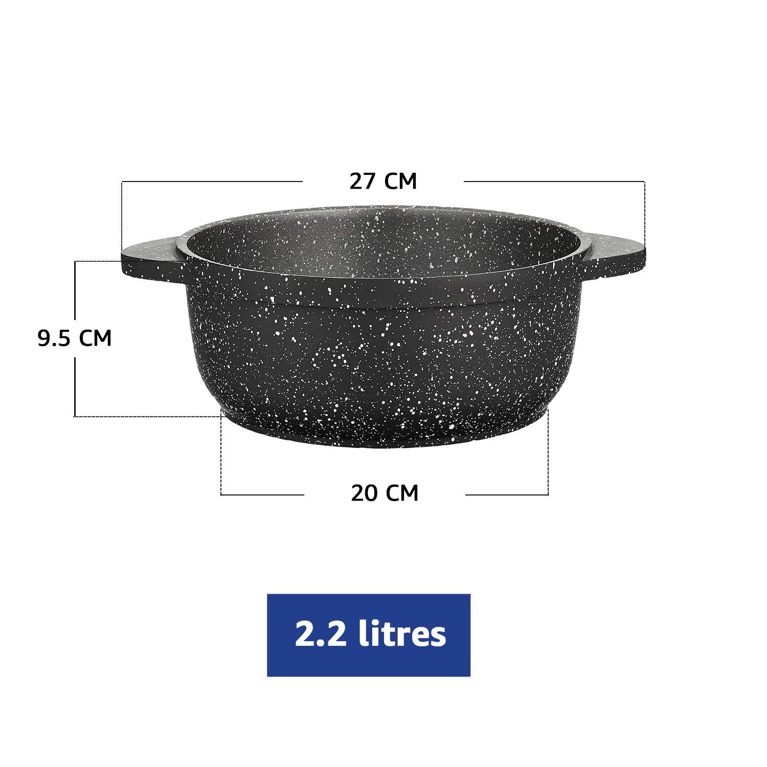 Suitable for sauteing and cooking a wide variety of food like rice, pulao, biryani, pasta, along with meat, fish and other proteins;Dimensions- Length: 270 mm, Width: 200 mm, Depth: 95 mm; Diameter: 200 mm, Bottom Thickness: 4 mm;Package Contents- 1 Solimo Die Cast Aluminium Non Stick Casserole; Capacity: 2,200 ml;