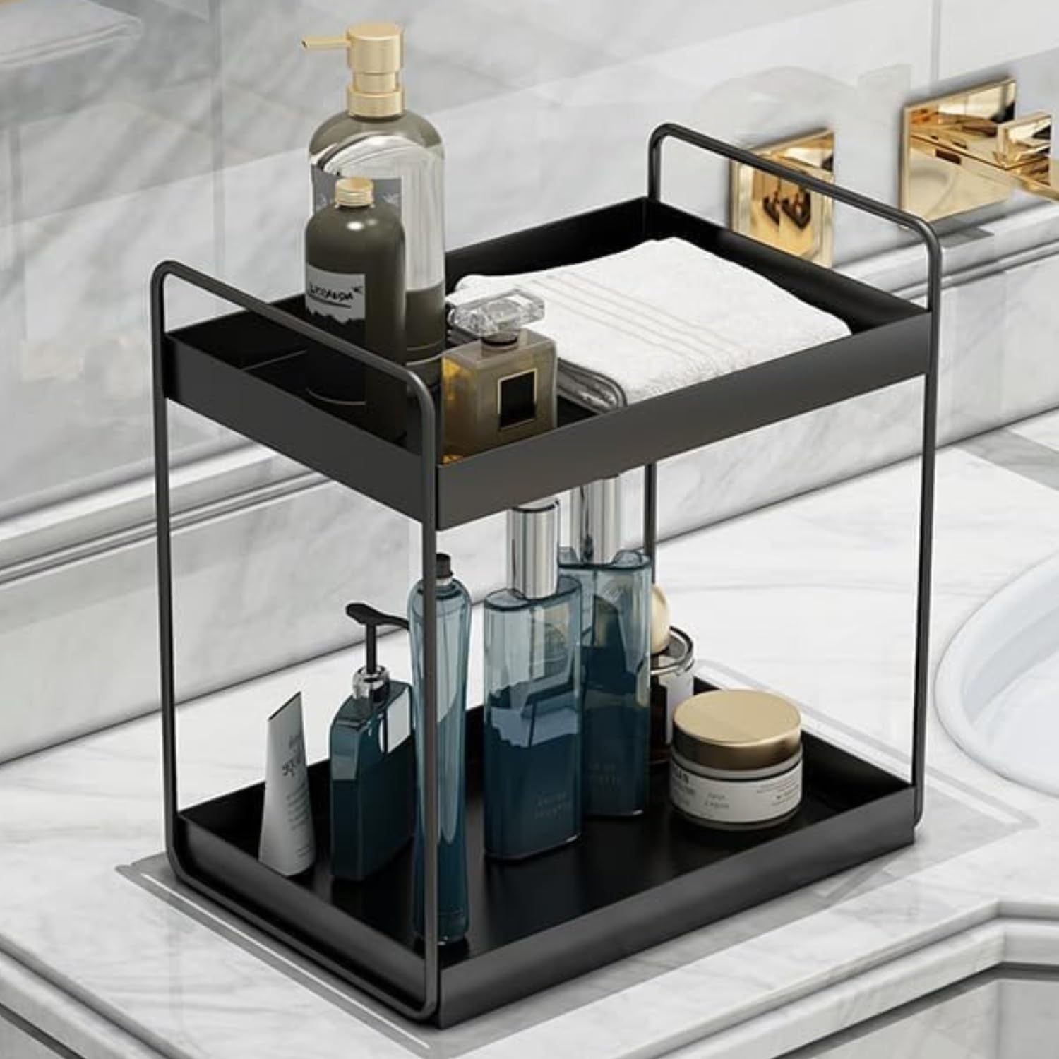 Upgrade your storage game with the AMEXTRON Metal 2-Tier Countertop Organizer Rack?your perfect blend of style, durability, and functionality for a clutter-free home. Whether you?re organizing spices in your kitchen, skincare in your bathroom, or supplies in your home office, this versatile kitchen organizer rack shelf adapts effortlessly to your needs. Built from robust powder-coated metal, this rack offers industrial-grade strength, supporting up to 20 kg per shelf without bending, making it an ideal kitchen rack stand or under sink storage organizer. Its sleek matte black finish complements every setting, while the open-perforated design ensures airflow and water drainage, keeping your items fresh and dry. Snap-together assembly requires no tools, so it?s up and running in minutes. Non-slip rubber feet prevent slipping and protect your surfaces, whether it?s granite, tile, marble, or wood. This compact yet roomy shelf maximizes vertical space, turning countertops into efficient, elegant storage zones. Ideal for storing jars, bottles, bathroom accessories, cleaning items, gadgets, or even notebooks, this kitchen organiser rack is perfect for modern lifestyles. Use it as a bathroom organiser, kitchen counter top organizer, or corner shelf for kitchen or office?this rack for kitchen storage transforms chaos into order. A must-have for smart homes, minimal spaces, and those who love tidy aesthetics, the AMEXTRON kitchen storage rack for home makes everyday organization simple and stylish. Rediscover the joy of organized living with this multi-functional kitchen stand designed for all your home storage & organisation needs.