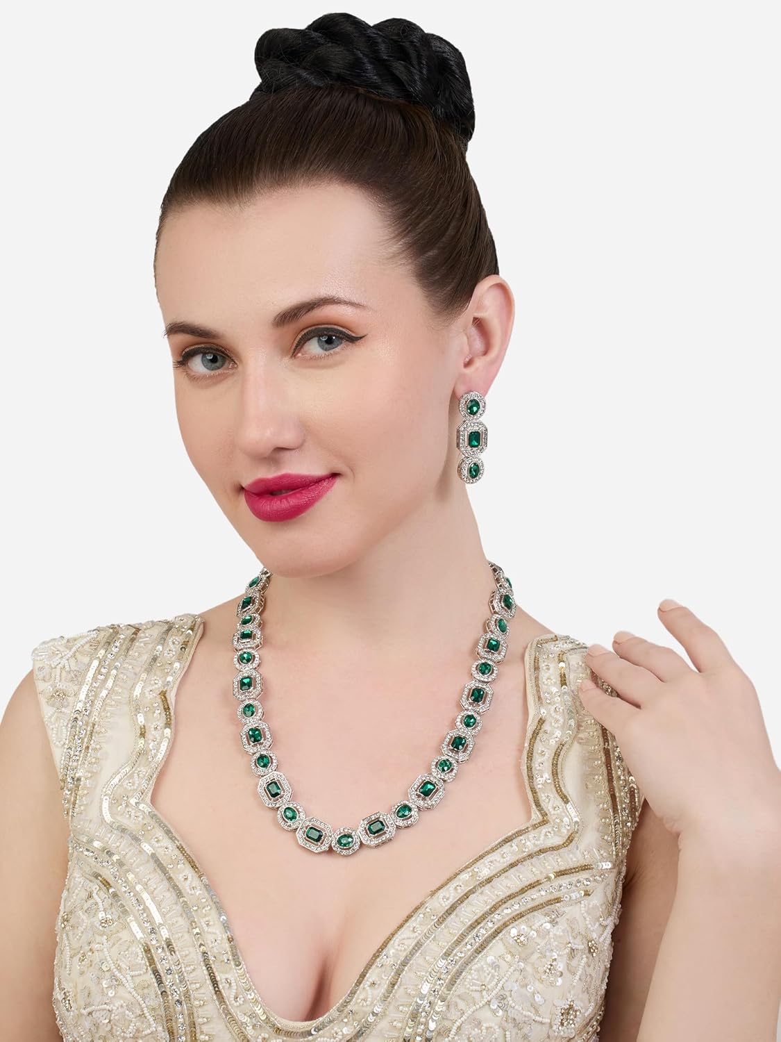 AMI Green Stones Dazzling Austrian Diamonds Bling Necklace & Earring Set For Women-ZPFK21181