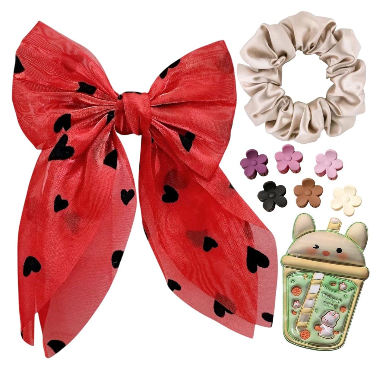 COMPLETE SET: Includes 1 decorative bow clip, 1 satin scrunchie, and 6 small clutcher clips, packaged in a cute gift pouch for convenient storage