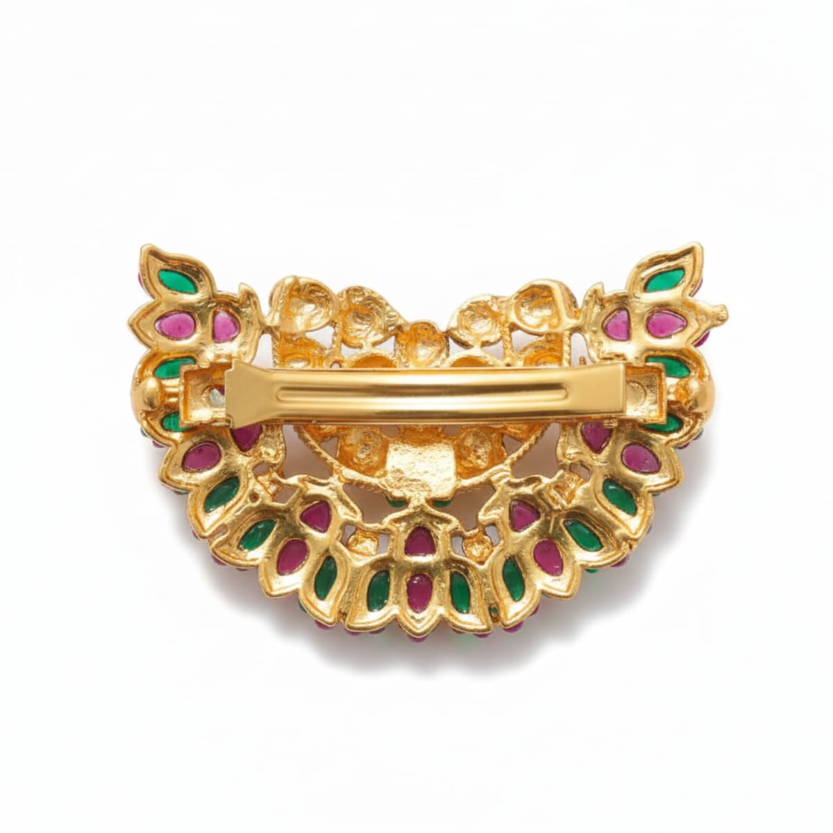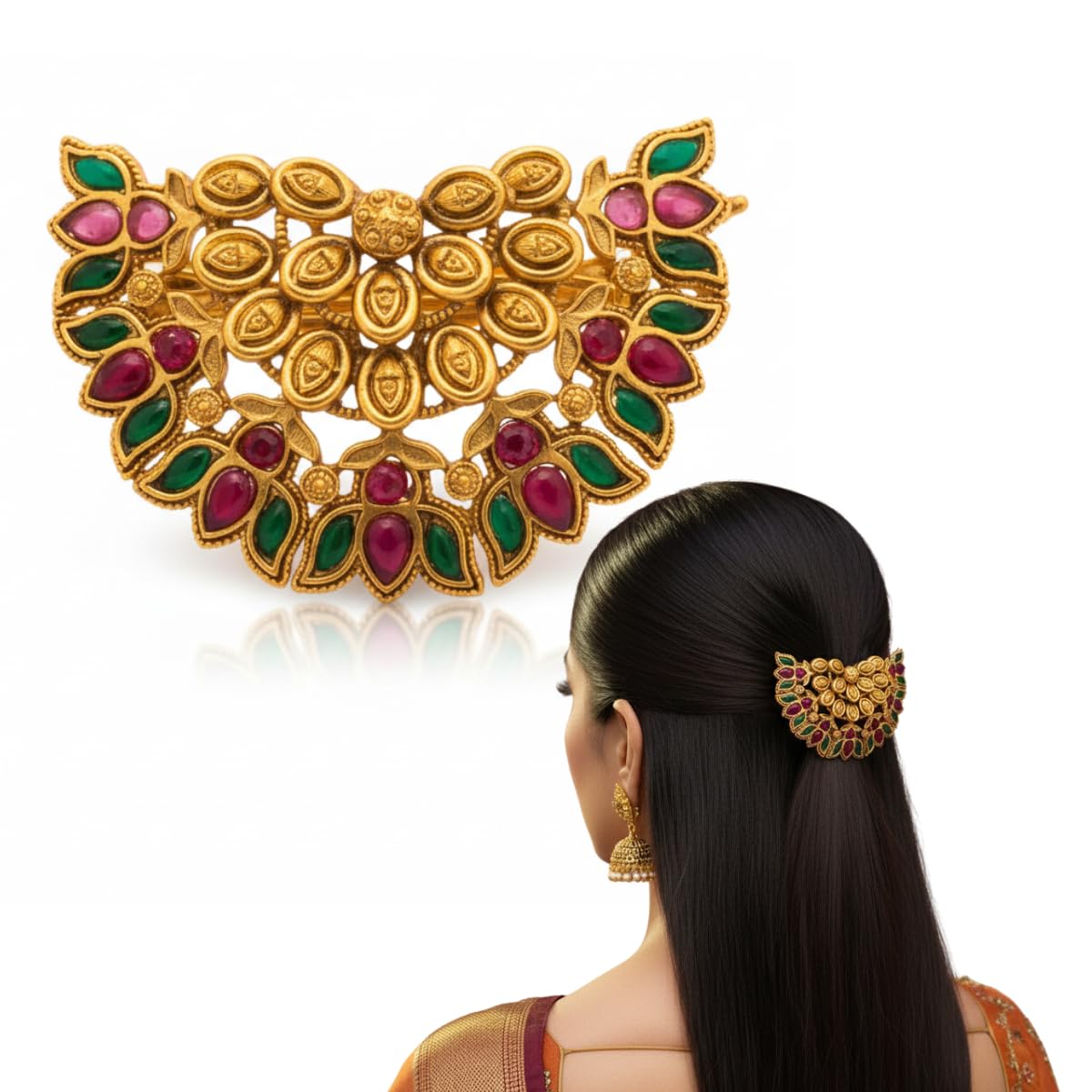 Enhance your traditional hairstyle with this exquisite Iksava Antique Gold Floral Hair Barrette, designed with handcrafted detailing and vibrant red–green stones. The floral motif adds timeless elegance, making it a perfect match for bridal, festive and classical Indian looks. The clip offers a strong yet comfortable grip, ensuring your bun or braid stays in place throughout long celebrations. This juda pin is ideal for weddings, festivals, Bharatanatyam or Kathak dance looks, temple ceremonies, Navratri garba styling, and bridal makeup hair settings. Pair it with sarees, lehengas, silk outfits and temple jewellery to complete a regal ethnic appearance. Lightweight, durable and beautifully designed — it’s a must-have accessory for every traditional jewellery collection.
