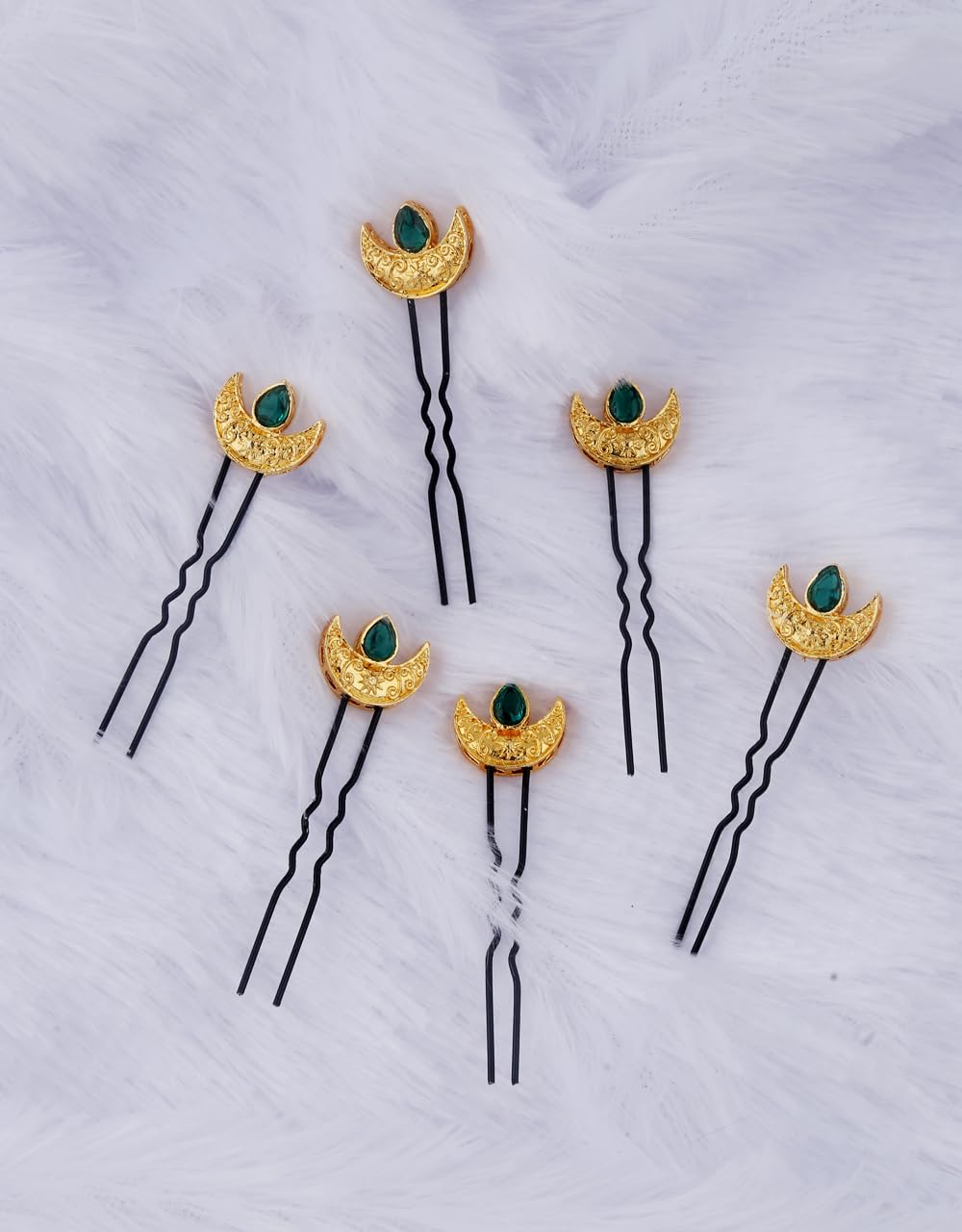 Enhance your hairstyle with the Anuradha Art Jewellery Golden Finish Chandrakor Kundan Juda Pins Encrusted with Green Stone (Pack of 6). These exquisite pins, featuring a golden finish and stunning Kundan stones, are perfect for creating elegant Marathi Juda or Ambada hairstyles. Ideal for weddings, festivals, and any special occasion, adding a touch of traditional beauty.