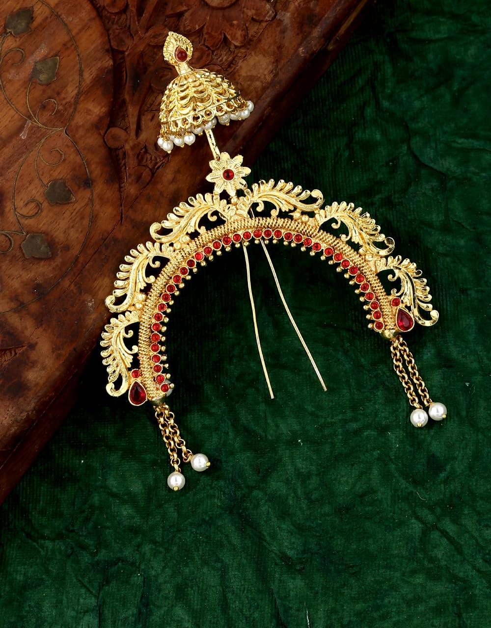 The Anuradha Art Maroon Color Designer Ambada Pin is a gorgeous piece of Maharashtrian jewelry. Designed for women and stylish girls, this traditional Juda pin features intricate craftsmanship and a striking maroon hue. Perfect for festive occasions and weddings, it beautifully enhances ethnic hairstyles with timeless elegance and cultural charm.
