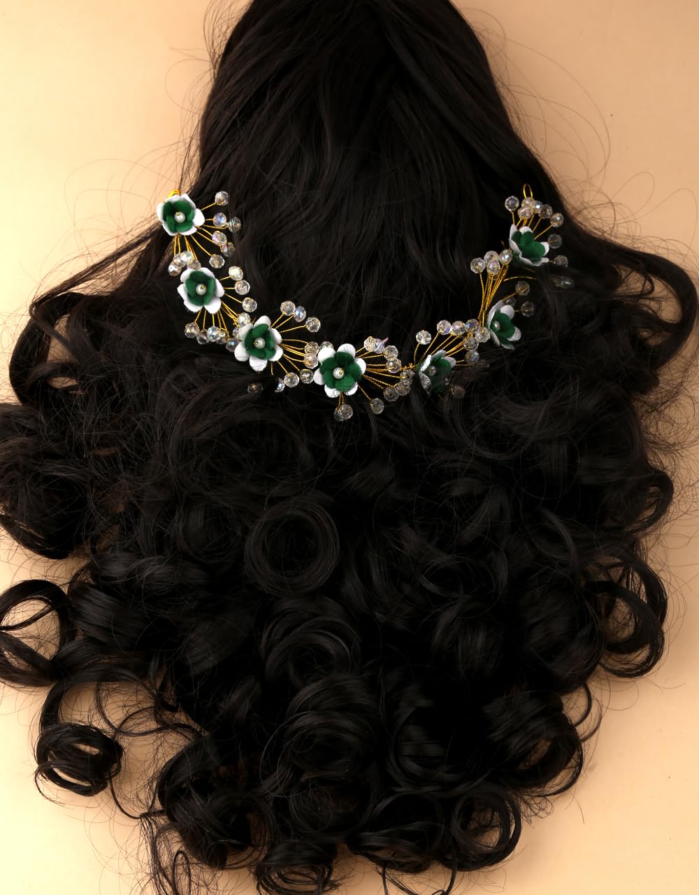 Elevate your wedding or festive look with Anuradha Pearl’s Latest Green And White Colour Hair Accessories for women and girls. Designed with artificial flowers and pearl-style embellishments, this floral bridal brooch and hairpin set enhances Juda bun hairstyles beautifully. Perfect for brides, it adds elegance and charm to any special occasion hairstyle.