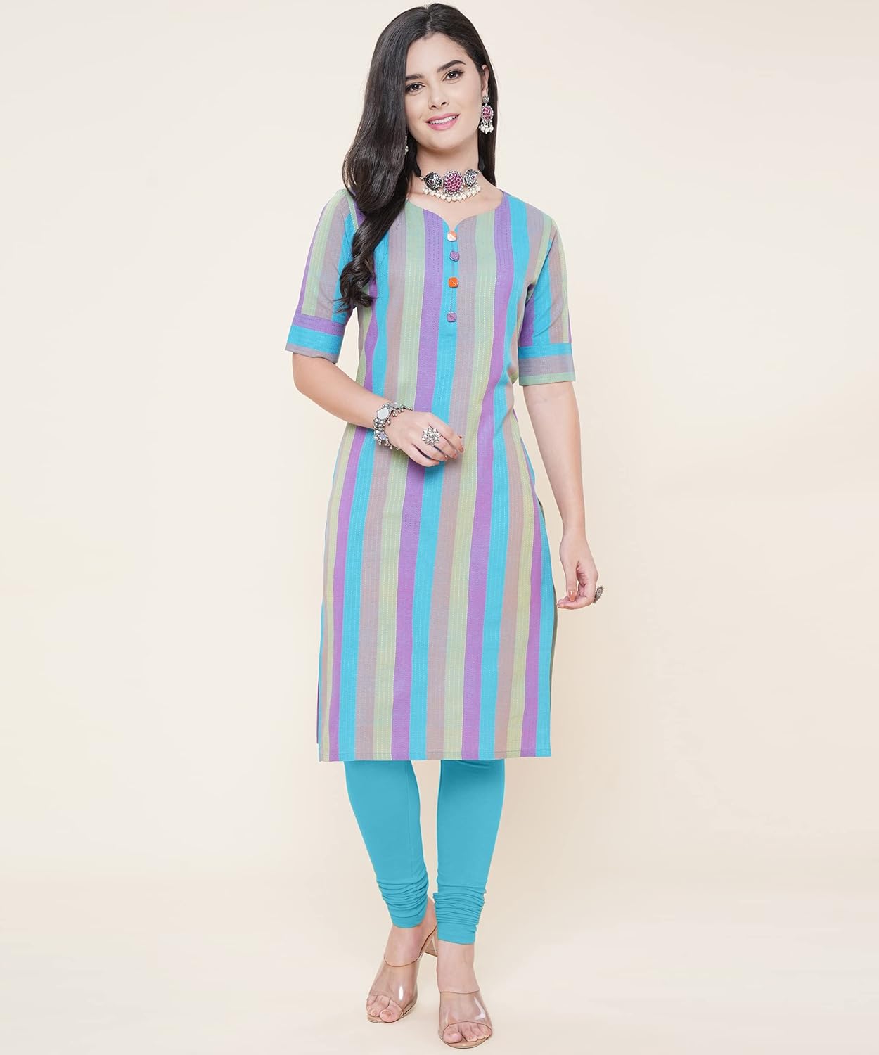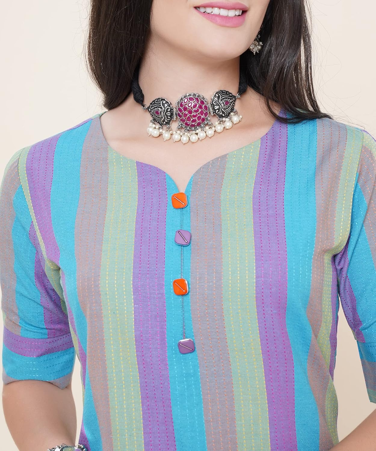 Cotton Kurti for Women Self Weaved Fabric Multicolour Striped Pattern