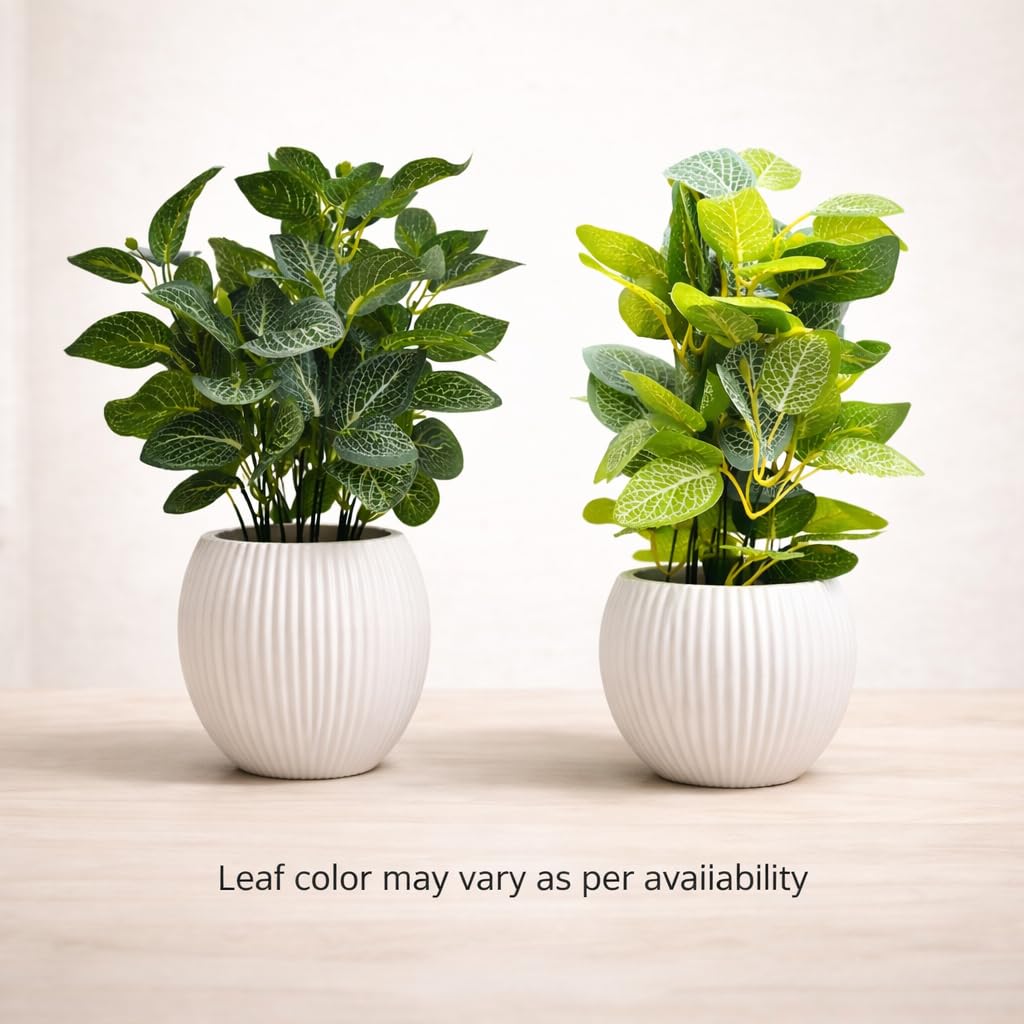 Realistic Green Leaf Design: Beautifully crafted artificial green leaf plant with a ribbed white pot, adding freshness and charm to any space