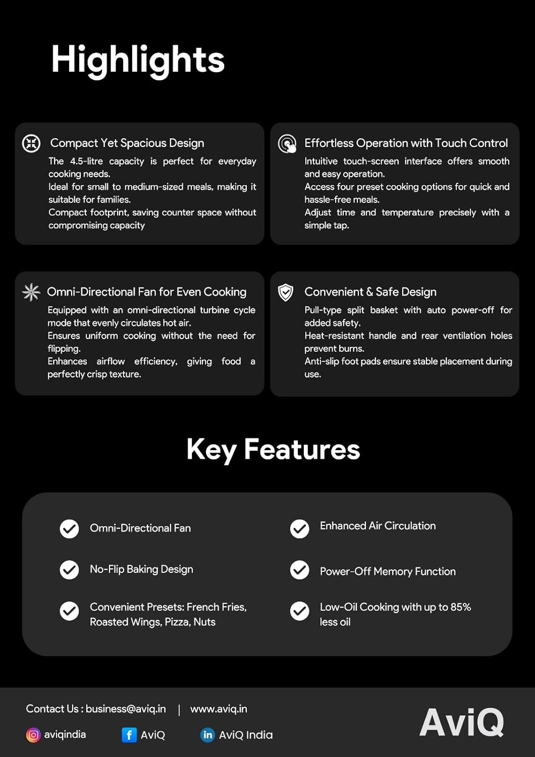 The AviQ Air Fryer is equipped with Uniform Motor Drive System for Omni-Directional Turbine Cycle Air Flow , ensuring consistent heat circulation and uniform cooking performance across all food surfaces.