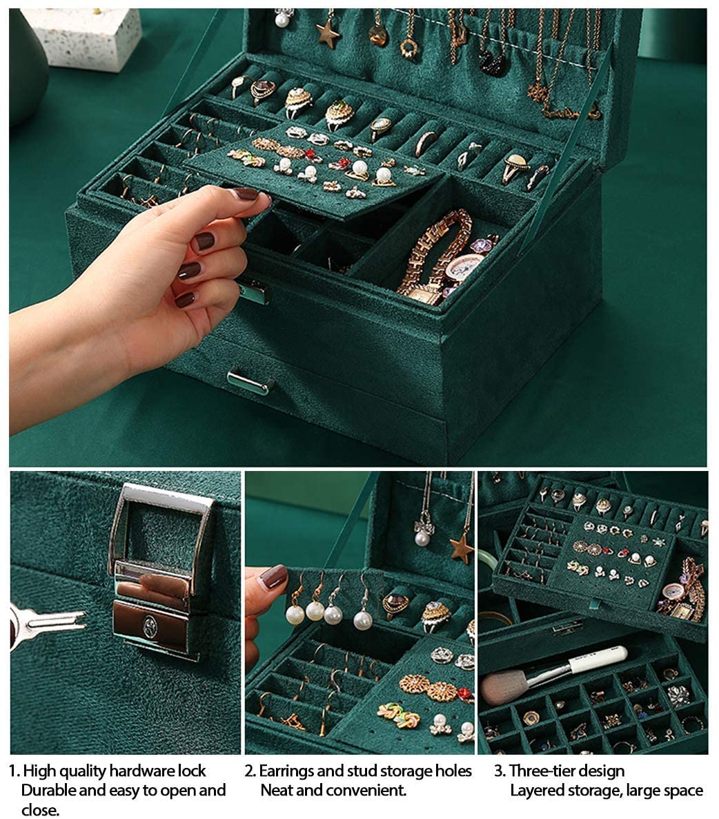 3-Tier Velvet Cloth Jewelry Display Holder Storage CaseCan keep your jewelry clean and tidy, and convenience for you to find them.The jewelry Box is of excellent layout, attractive appearance, multifunctional structure and fine workmanship.It is a great choice for storing your watches, rings, earrings, ear studs, necklaces, bracelets, cuff links, and brooches, etc.It’s also a wonderful gift for your friends, lover or family.Double LayersExquisite & Durble Lock and KeyCharming Colors to Decorate HomeSpace Saver to Avoid Jewelry Mass