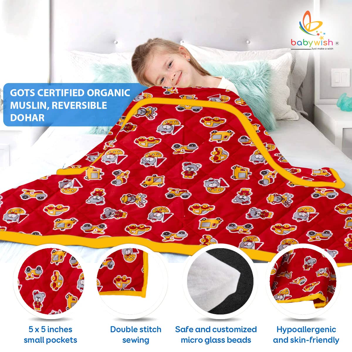 SAFEST TODDLER AND BABY MUSLIN BLANKETS – Made using GOTS CERTIFIED ORGANIC MUSLIN COTTON for the ultra-soft feel and to avoid any chemicals from being transferred by a regular printing process. 100% Hypoallergic and Breathable, Over-filled with breathable Microfiber filling inside, it is soft and comfortable for infant, newborn or toddler. Proved to help your little one stay warm and comfortable in winter. Comforts baby into sleep within minutes. MULTI LAYERS BREATHABLE WITH THICK FILLING INSIDE: Babywish blankets are Ten times thicker than standard ones, providing four soothing layers of the GOTS certified muslin cotton for your baby to cuddle with in a warm and secure environment. 100% toxic-free micro sheets bead evenly disperse around the blanket, compartmented with strong stitching. 100% breathable 220 GSM Microfiber filling are both gentle on the skin with reassuring sensations. BIGGEST REVERSIBLE MUSLIN DUVET DOHAR IN MARKET: Made from certified Organic muslin cotton, our multi-layer toddler blankets are designed with a delicate workmanship that offers unbeatable softness and warm, all year-round comfort. This blanket is designed reversibly which is very convenient and durable, this quilted throw is reversible, both sides could be used individually. No duvet cover is needed. Generously Sized blanket with 32X48 Inch, it is not too small nor too large for standard crib or toddler bed. It will cover baby’s body perfectly.