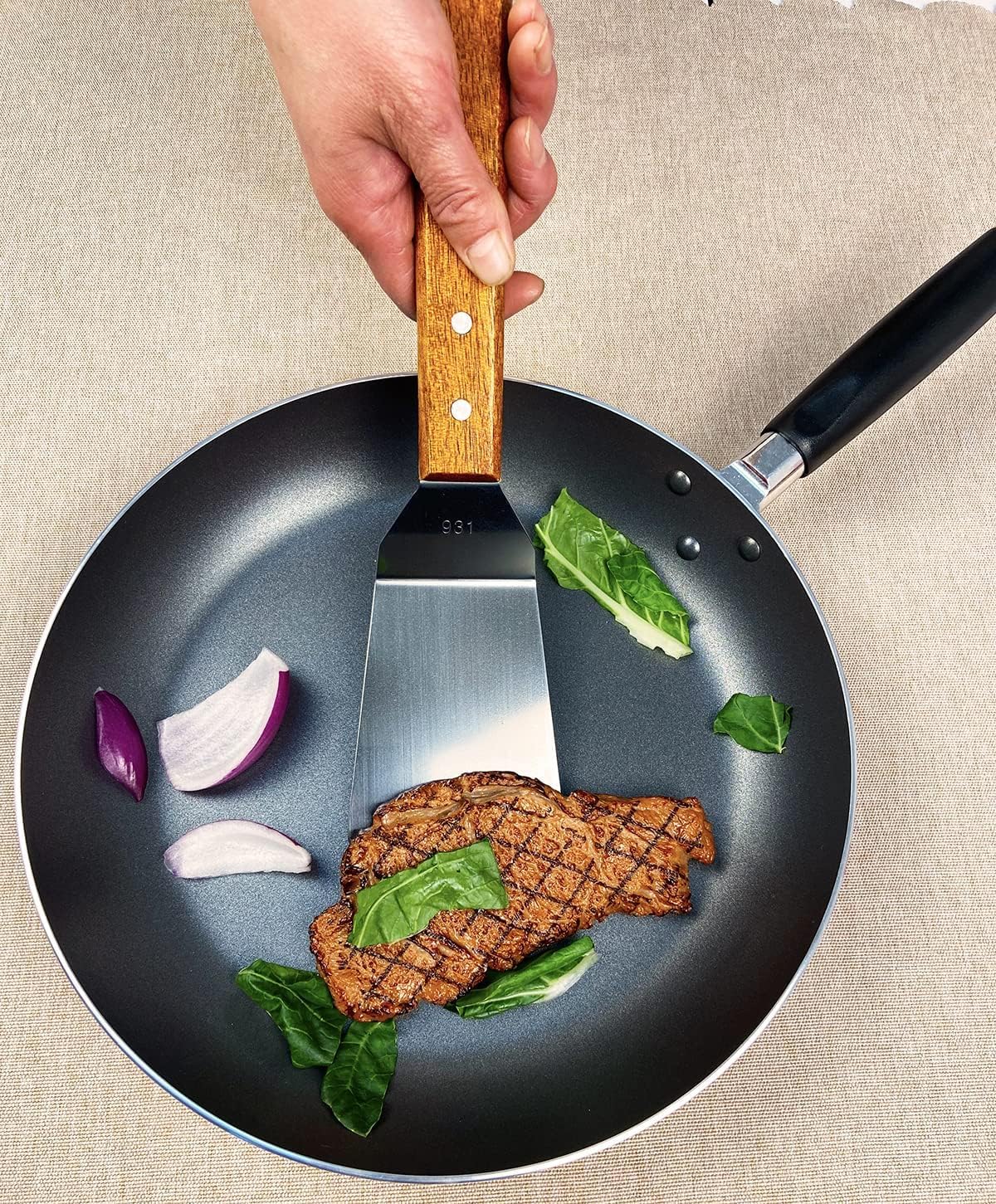 FIRM GRIP – ergonomic and comfortable wooden handle with hole for easy hanging. Flat spatula stainless steel turner are very well balanced . Metal spatula is hand wash only.