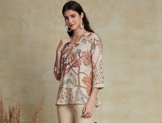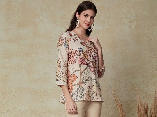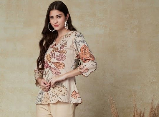 Elevate your wardrobe with this Women’s Crepe Floral Printed Beige Top, designed for comfort and style. Featuring a unique floral print, this top offers a refreshing and chic look that’s perfect for casual outings, office wear, or a stylish evening event. The soft crepe fabric ensures all-day comfort, while the flattering notched neck and 3/4th sleeves make it a perfect blend of elegance and casual wear. With its hip-length fit and curved hemline, this top can be paired effortlessly with jeans, skirts, or leggings, making it a versatile addition to your wardrobe. The sophisticated beige color complements the floral pattern, adding a stylish yet understated vibe to any outfit. Whether you’re looking for a top for jeans, a tunic-style shirt, or a fashionable blouse for daily wear, this floral top is a must-have for every woman. Ideal for women who appreciate timeless style with a modern twist, this top can be worn for various occasions—from casual day trips to party events. Enhance your wardrobe with this go-to top for a fashionable, effortless look that can easily transition from day to night.