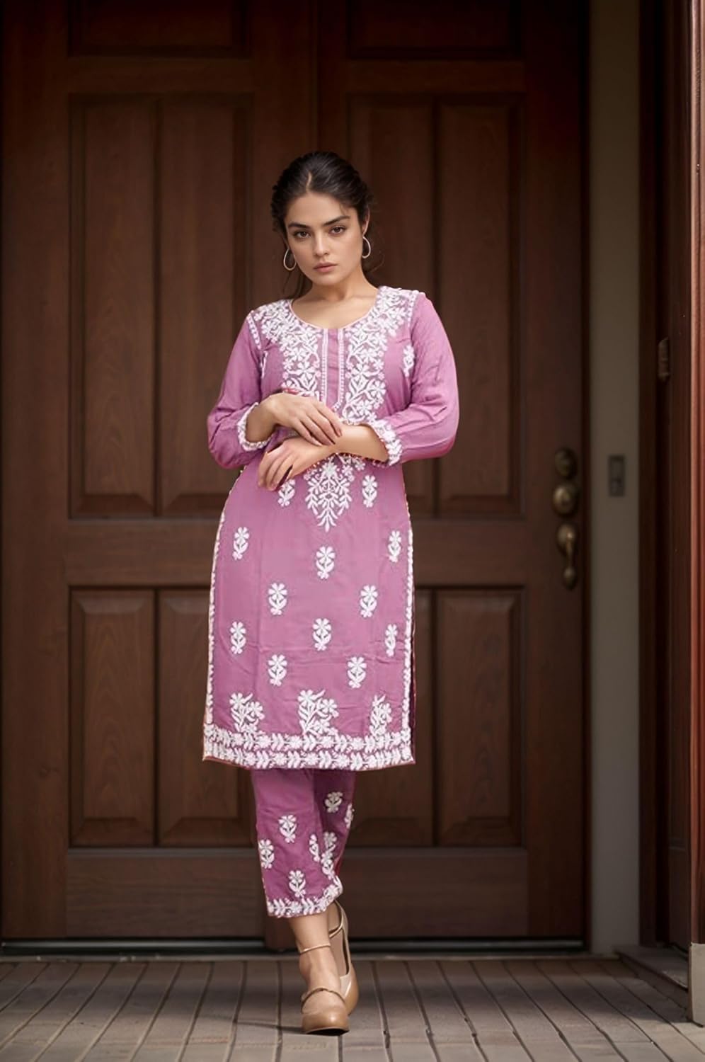 Chikan Hand Embroidered Cotton Blend Lucknowi Chikankari Red Kurta Kurti for Women