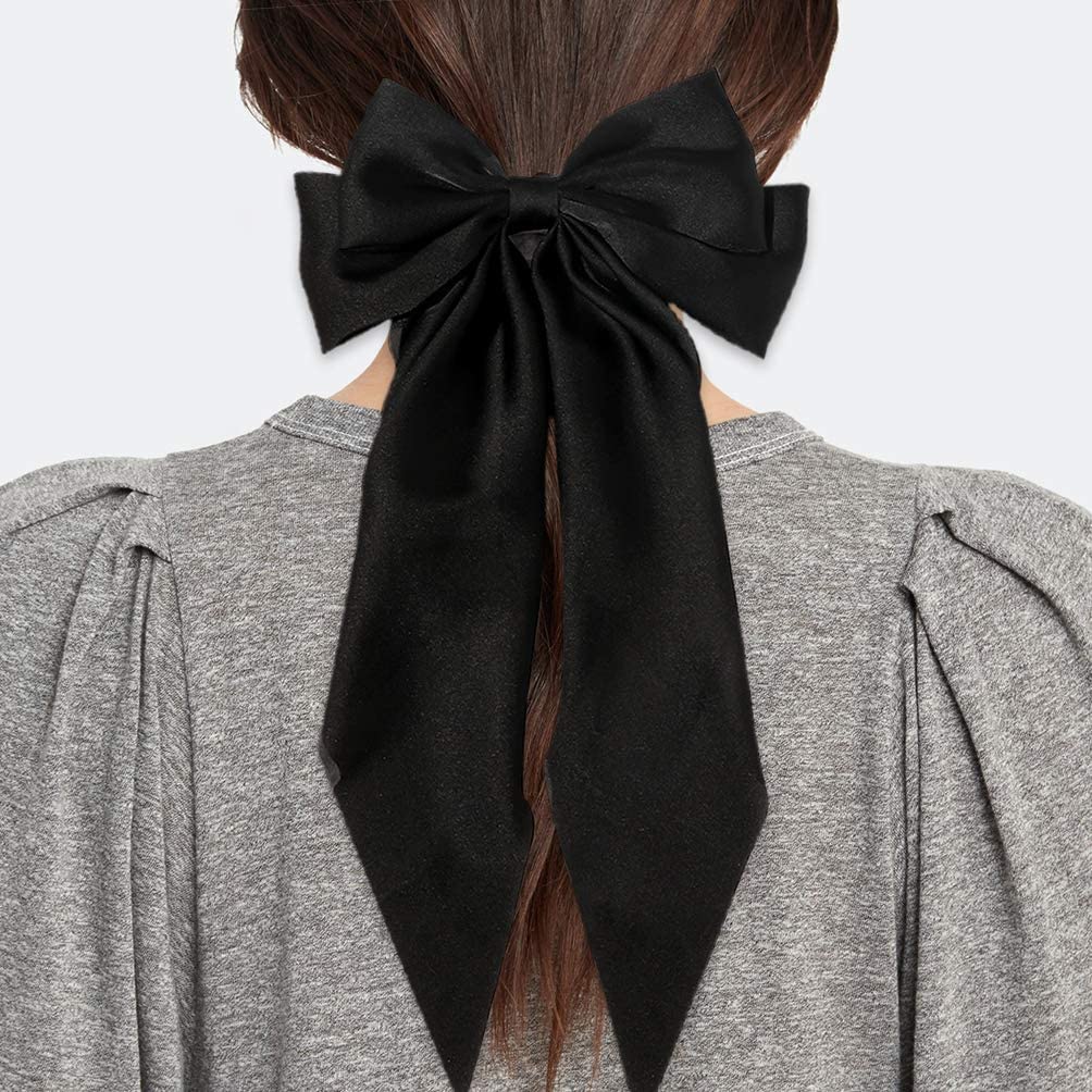 Big Satin Layered Hair Bows for Women Girls 11 Inch Barrette Hair Clip Long Black Ribbon Bows French Style Hair Accessories (Black)