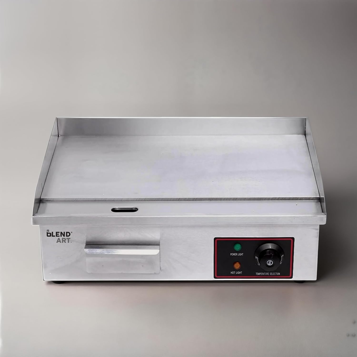 The BlendArt Stainless Steel Electric Griddle is a high-performance, commercial-grade appliance designed for restaurants, hotels, cafes, and home kitchens. Featuring a 1.8 ft Teflon-coated non-stick plate, it ensures oil-free cooking and easy cleaning. With six adjustable temperature settings, you can precisely control heat for dosa, teppanyaki, pancakes, and more. The powerful 3000W heating system provides even heat distribution, delivering consistent cooking results. Built with durable stainless steel, this griddle is resistant to bubble water damage, ensuring long-lasting performance. Its compact tabletop design saves space while offering efficient, high-quality cooking. Perfect for professional chefs and home cooks, the BlendArt Electric Griddle combines power, precision, and durability for an enhanced cooking experience.