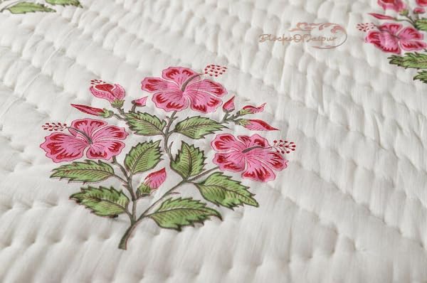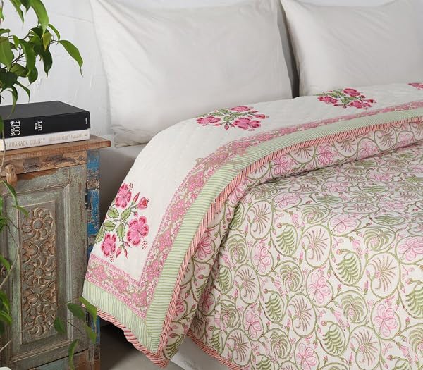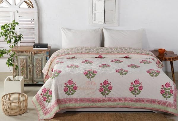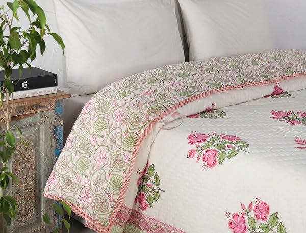 BLOCKS OF JAIPUR Original Pure Cotton Jaipuri Razai All-Weather Block Flower Print Reversible Comforter Lightweight AC Quilt Summer and Winter Bedding | Throw Bed Blanket (King Size 108X108 in)