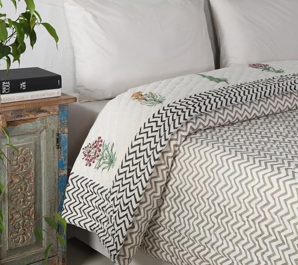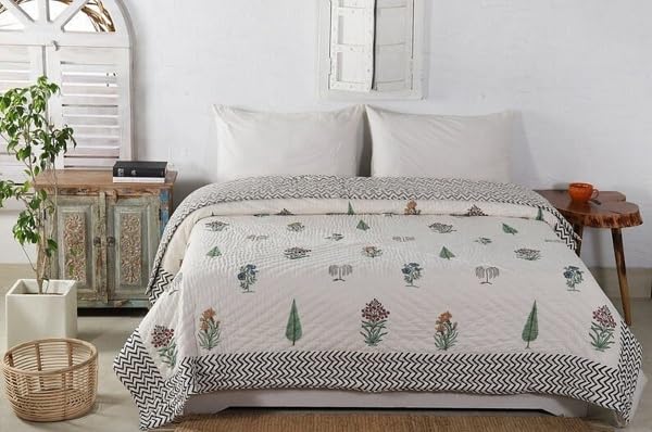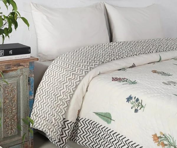 BLOCKS OF JAIPUR Original Pure Cotton Jaipuri Razai Hand Block Multi Flower Print Reversible Comforter Lightweight AC Quilt Summer and Winter Bedding | Throw Bed Blanket (Double Bed 90X108 in)