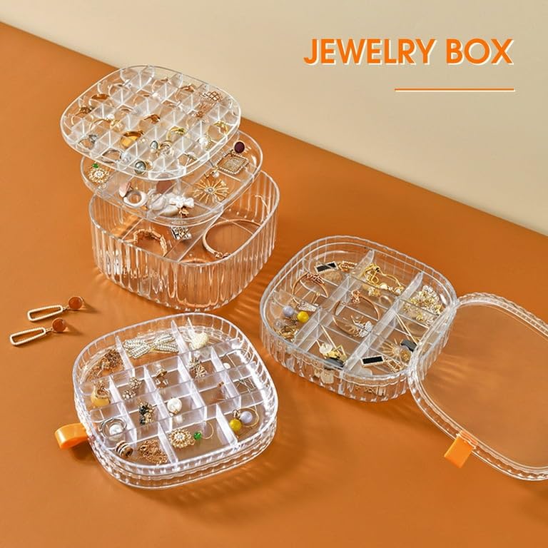Transparent Design: Jewelry case designed with a transparent shell for easily view and access, allowing you to find your favorite jewelry at a glance.There are 2 stackable layer and a total of 36 grids, with multiple separated storage cells for storing jewelries in different size and shape.