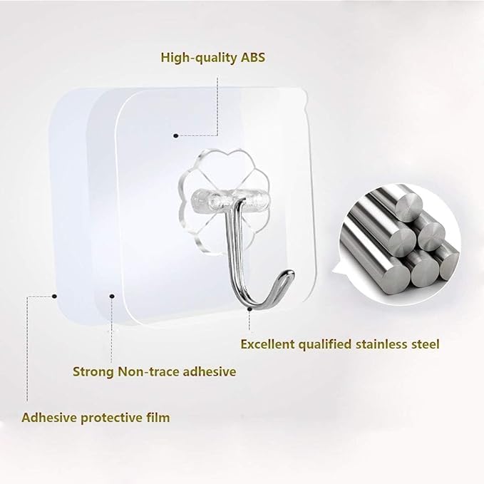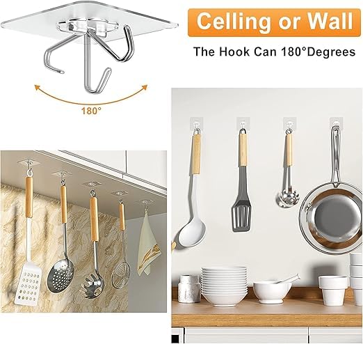 Self-Adhesive Transparent Wall Hooks (Pack of 10) – Heavy-Duty, Waterproof, Reusable Upgrade your home organization with these strong, self-adhesive wall hooks, designed for effortless storage and hanging solutions. Whether it’s for your kitchen, bathroom, living room, or office, these hooks provide a secure hold without the need for drilling or damaging walls. Where to Use: ✔️ Kitchen – Utensils, dish towels, cutting boards ✔️ Bathroom – Loofahs, towels, toiletries ✔️ Bedroom – Keys, jewelry, accessories ✔️ Living Room – Decorations, frames, fairy lights ✔️ Office – Stationery, cords, small organizers. How to Use: Clean & Dry the surface before applying. Peel off the protective film from the adhesive side. Stick the hook firmly on the surface and press for a few seconds. Wait 24 hours before hanging heavy items for better adhesion.