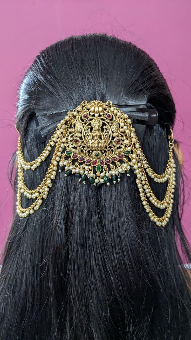 The Jada Billai is a decorative ornament that is placed along the length of a braid. This particular style features multiple circular or floral medallions, often adorned with intricate detailing, which cascade down the braid. These medallions are often embellished with gold plating, intricate carvings, or encrusted with stones and pearls to create a royal appearance.