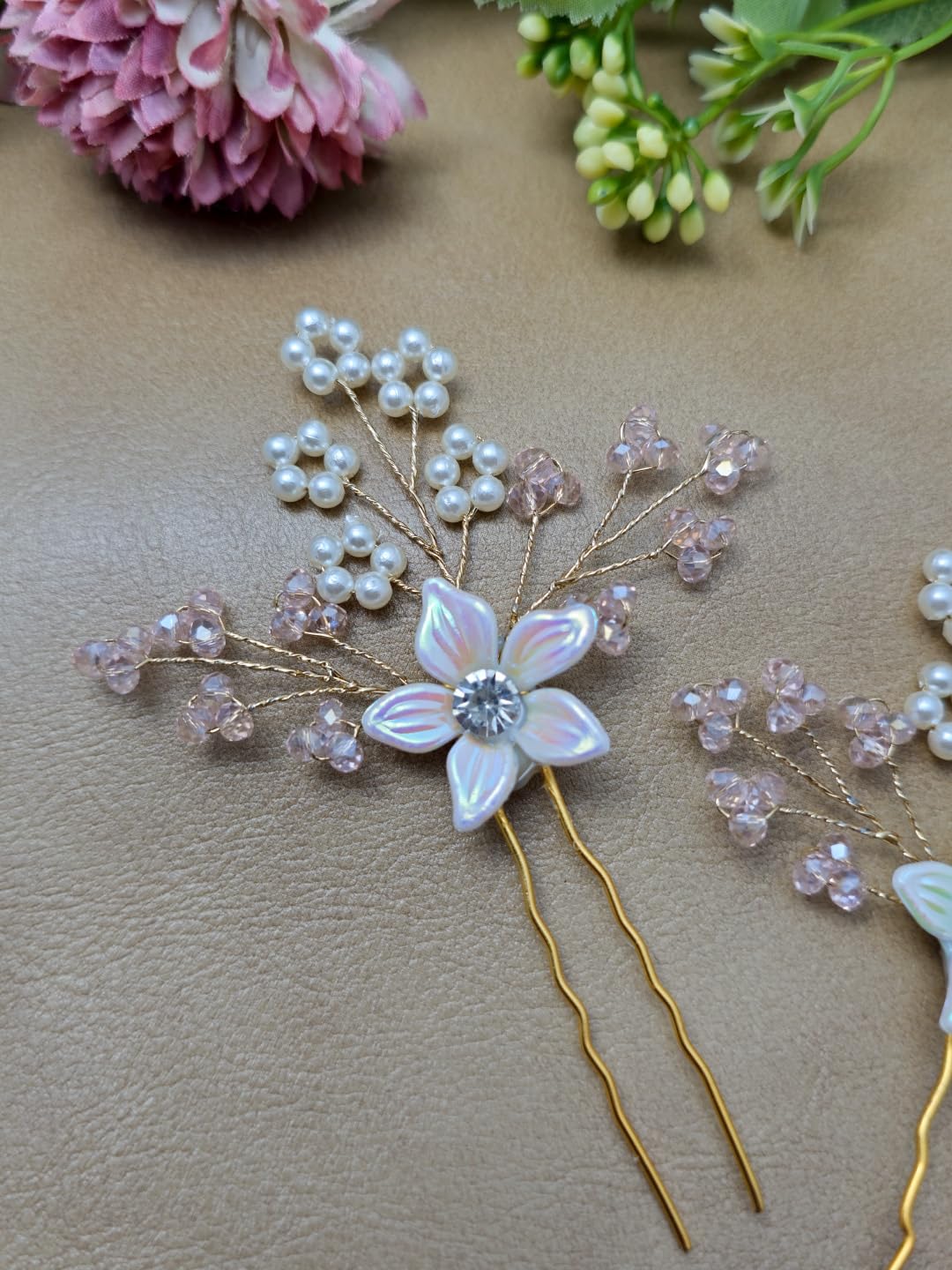 ELEGANT DESIGN: Handcrafted hair pins featuring iridescent white crystal flowers with pink accents, complemented by delicate pearl clusters and crystal beads