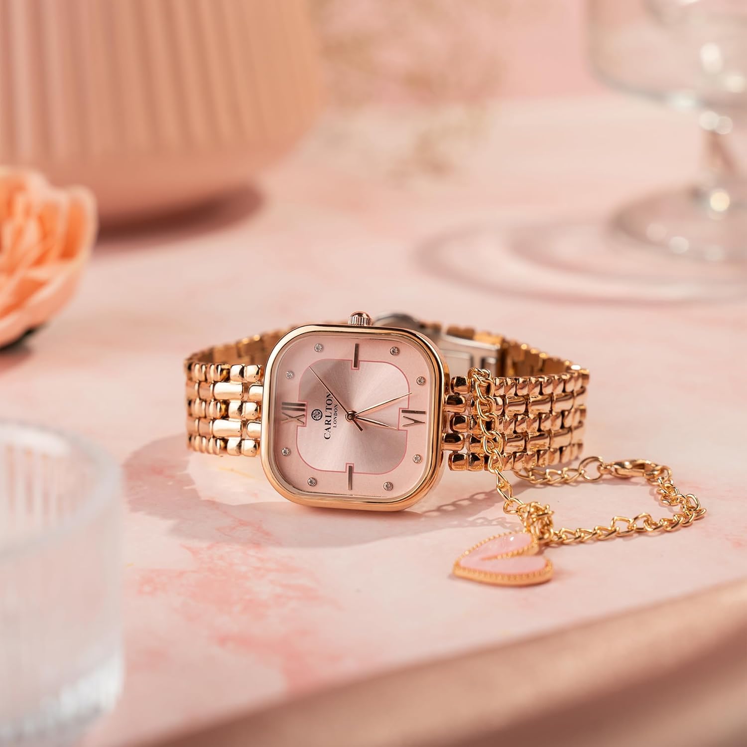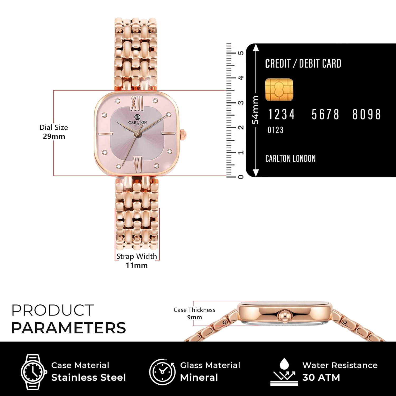 Elevate your everyday style with the Carlton London Chelsea Women Analog Watch, a perfect blend of elegance, functionality, and modern design. Designed for the contemporary woman, this stylish women’s watch features a sleek 29mm square dial that adds a sophisticated and refined touch to your wrist. Whether you’re heading to the office, a casual outing, or a special occasion, this elegant analog watch for women complements both western and ethnic outfits effortlessly. Crafted with a durable metal case and a premium stainless steel strap, this ladies bracelet watch offers long-lasting shine and comfort. The secure clasp ensures a snug and comfortable fit, making it ideal for daily wear. The scratch-resistant mineral glass protects the dial from everyday wear and tear, keeping your women’s wrist watch looking new for longer. Powered by precise quartz movement, this analog watch for women delivers accurate and reliable timekeeping. The battery-operated mechanism ensures low maintenance and consistent performance, making it a dependable accessory for your busy lifestyle. With 30 meters water resistance, this fashion watch for women is suitable for everyday use and protected against minor splashes. Minimal yet eye-catching, this Carlton London women watch is designed for those who appreciate timeless fashion with a modern twist. Its clean dial layout enhances readability while maintaining a luxurious appeal. This stylish ladies watch for women also makes a perfect gift for women on birthdays, anniversaries, Valentine’s Day, weddings, or festive occasions. Beautifully designed and versatile, it is a must-have fashion accessory that adds grace and confidence to every look.